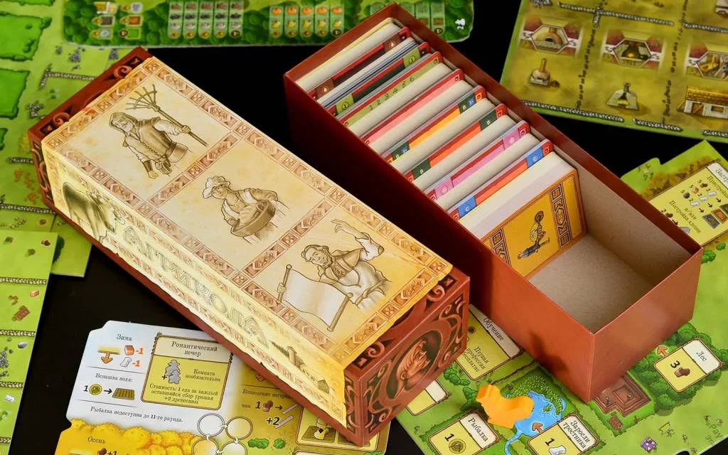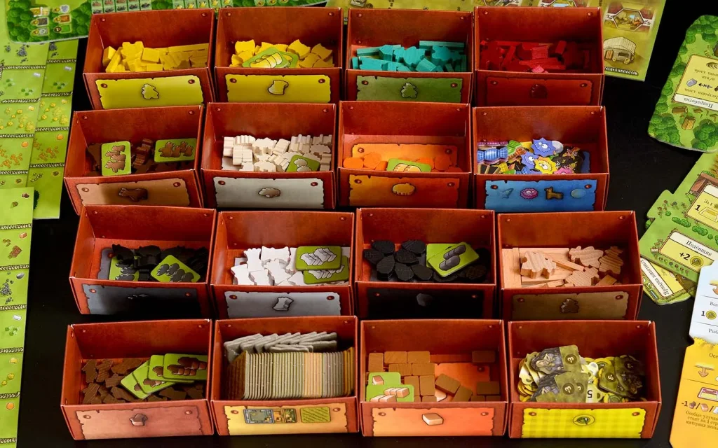 Компонентов в коробке действительно много: более 270 деревянных фишек, отдельные ресурсы, животные, заборы, жетон первого игрока и прочие элементы, благодаря которым ферма выглядит объёмно и живо. Составной планшет поля, дополнительные расширения, планшет улучшений и четыре планшета ферм с уникальным оформлением помогают удобно разложить игру и сохранить читаемость происходящего даже при большом количестве элементов на столе. Внутри коробки предусмотрен продуманный органайзер: контейнер для карт с разделителями, отдельные коробочки под ресурсы и фишки, что заметно ускоряет подготовку к партии и сбор игры после.