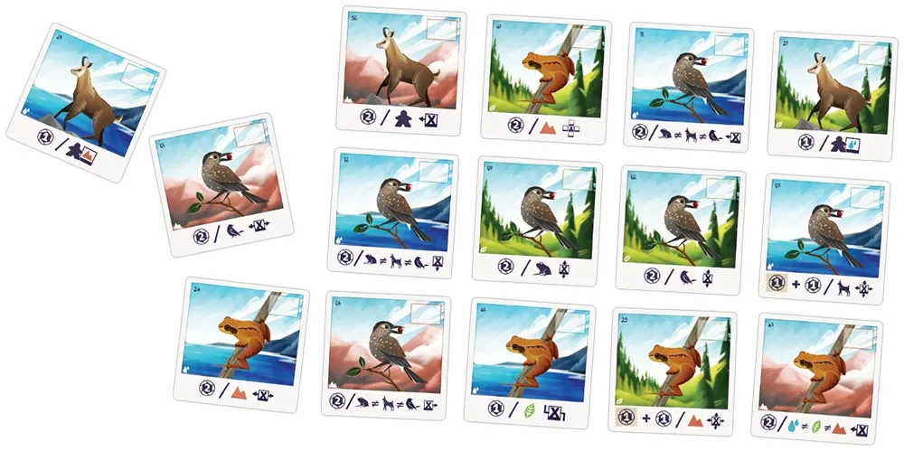 Цель у всех игроков одна — заполнить общий альбом фотографиями дикой природы, выкладывая карты в сетку 5×5. В центр стола формируется «страница альбома» — поле, куда вы будете добавлять новые снимки; каждая карта изображает часть пейзажа или сцену с животными, растениями и другими деталями Альп. В свой ход игрок обязан добавить как минимум одну карту к уже выложенным, соблюдая границы сетки: новая фотография должна примыкать к существующей по вертикали или горизонтали и не выходить за пределы будущего альбома.