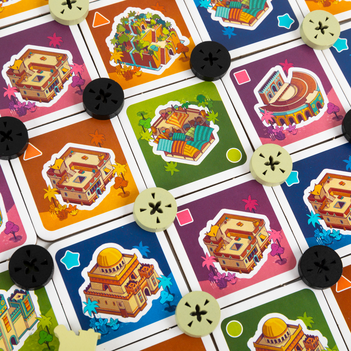 Затем вы выбираете тайл постройки из доступных. Для этого архитектора ставят на выбранную стопку на планшете построек, а верхний тайл берут в руку. Таким образом, фигуры архитекторов постепенно «заставляют» разные колонны, ограничивая сопернику выбор и открывая возможности для выстраивания трёх в ряд.