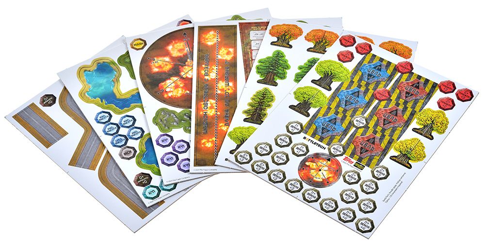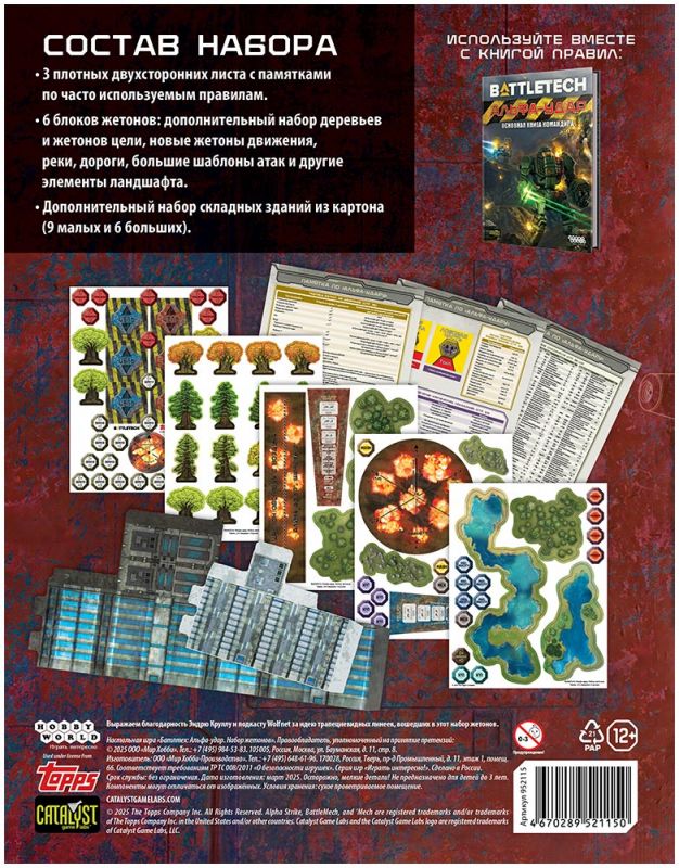 Набор дополнительно включает складные здания из картона — девять малых и шесть больших. Эти конструкции совместимы с теми, что входят в коробочный набор «BattleTech: Альфа-удар», и фактически увеличивают «городской» арсенал игроков: можно строить более крупные города, промышленные зоны и укреплённые базы. В обсуждениях Alpha Strike Counters Pack отмечается, что по содержанию он повторяет базовые здания и деревья из стартового набора, добавляя к ним новые маркеры местности и вспомогательные элементы. Это особенно ценно, если у вас уже есть миниатюры и правила, но не хватает объёмного окружения для поля боя.