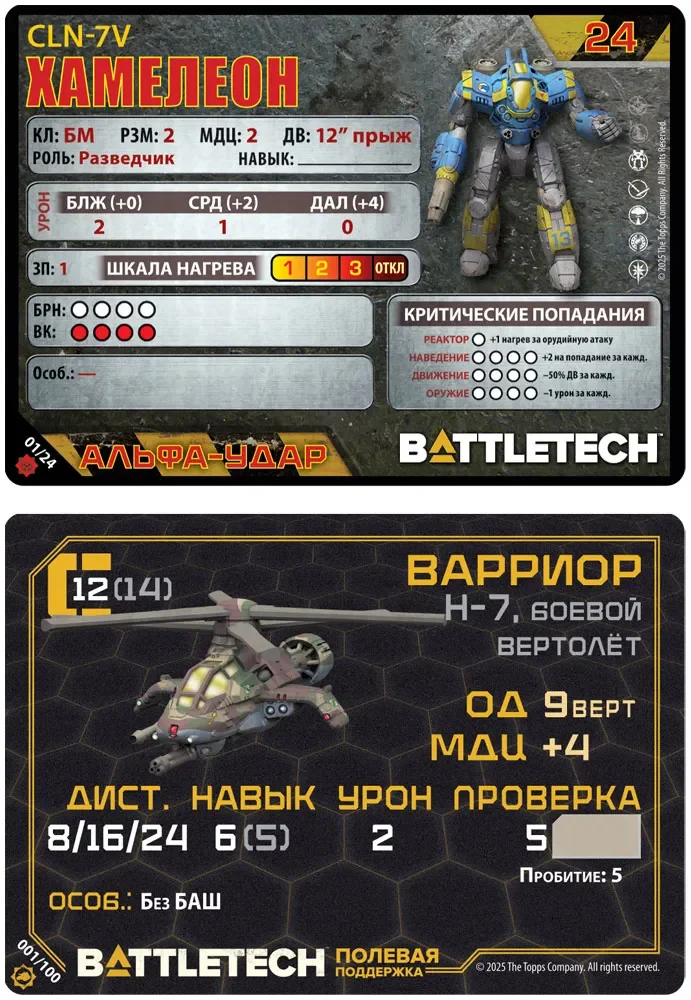 В коробку входят две двусторонние цветные карты местности и блоки жетонов, расширяющие варианты полей боя и тактических ситуаций. Карты представляют разные ландшафты, а жетоны помогают отобразить на столе укрытия, особые зоны, эффекты и другие элементы сценариев. Это делает каждую миссию визуально отличимой и добавляет глубины к привычной тактике размещения мехов и техники.
