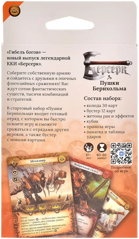 Набор «Пушки Бернхольма» входит в категорию «Начинающим игрокам» и хорошо подходит как для первого знакомства с игрой, так и для возвращения в «Берсерк» на волне нового сета. В коробке вы найдёте не только карты, но и необходимые аксессуары: жетоны ран и эффектов, кубик, памятку и таблицу ударов, а также правила, позволяющие быстро освоить основы даже тем, кто никогда раньше не играл в ККИ. В сочетании с другими стартовыми наборами «Гибели богов» этот набор даёт готовый мини‑пул для регулярных дуэлей и постепенного расширения коллекции.