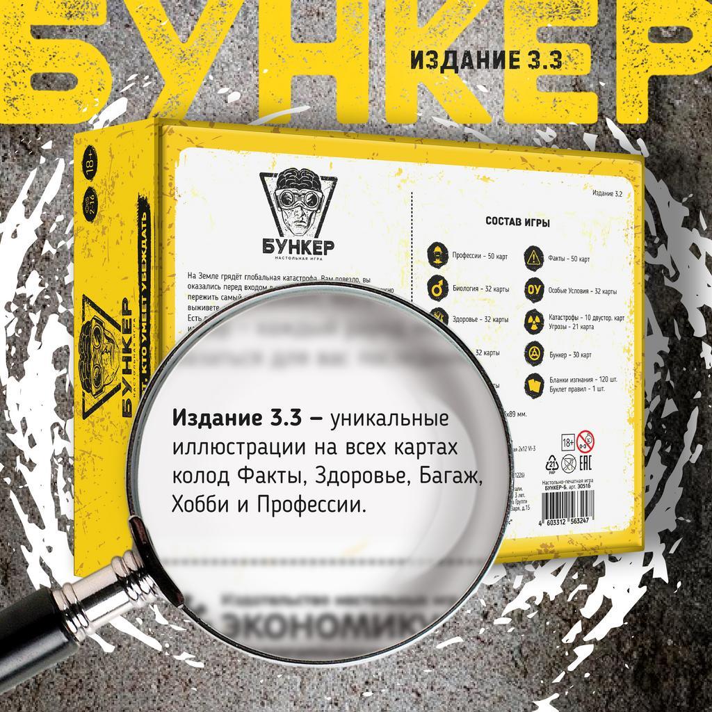 Особенность издания «Бункер» 3.3 – это обновлённые, иллюстрированные колоды и актуальные карты. В этой версии присутствуют уникальные иллюстрации на всех картах «Багаж», «Хобби», «Факты» и «Здоровье», что делает набор персонажей более наглядным и атмосферным. В комплект также входит карта «Кода доступа», а часть карт была переработана по сравнению с предыдущими версиями, что освежает партии и добавляет вариативности.