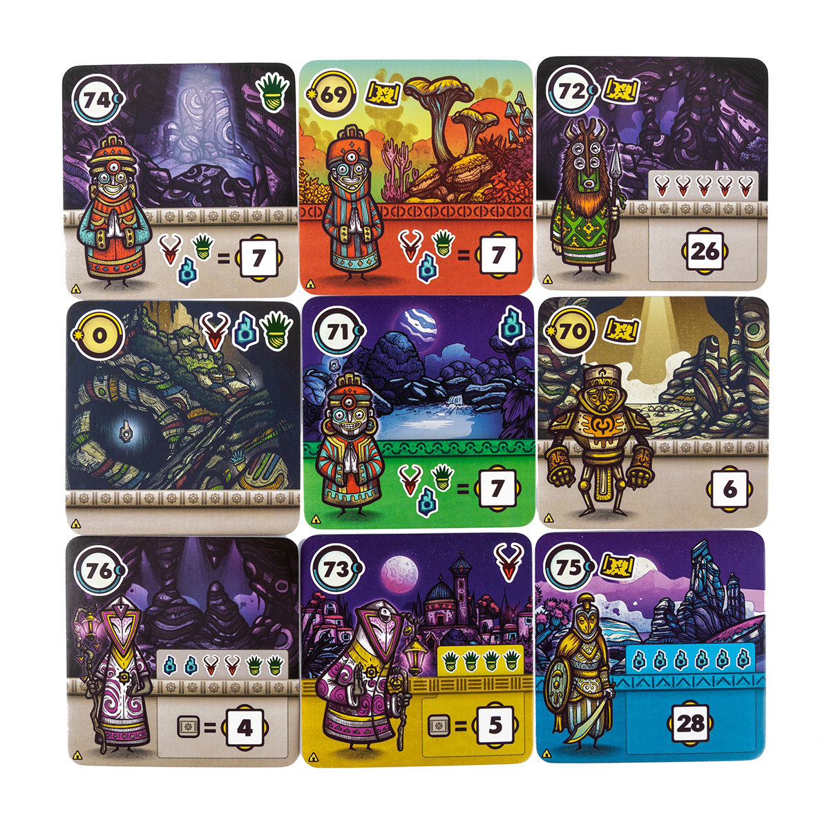 Дополнение усиливает и роль карточек святилищ. В базовой игре святилища уже давали бонусы и дополнительные возможности для набора очков, а «Антиподы» добавляют новые варианты таких карт. Святилища могут давать мгновенные преимущества, влиять на условия заданий или приносить очки при выполнении определённых комбинаций символов и регионов. Это добавляет гибкости при построении своей цепочки и делает каждое решение об открытии святилища более значимым.