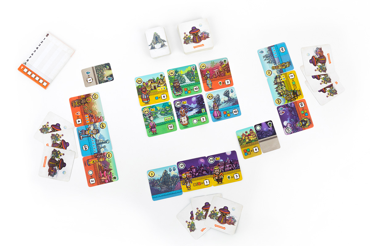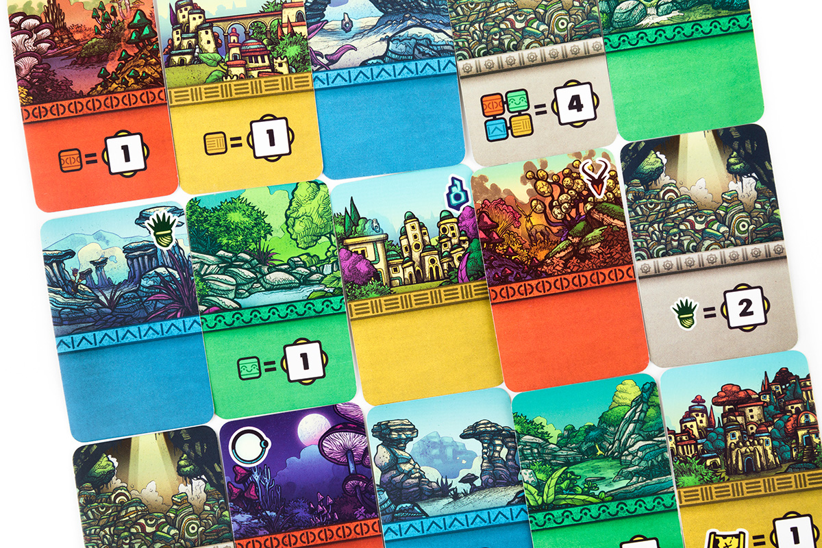 Все игроки одновременно выбирают одну карту из руки и кладут её перед собой лицевой стороной вниз. Затем они одновременно раскрывают выбранные ими карты и добавляют их в свои игровые области, справа от карты, сыгранной ими в предыдущем раунде. На картах региона вам встретятся местные жители, которые дадут вам задания на поиск определённых ресурсов, выполнение которых принесёт вам очки славы в конце игры.