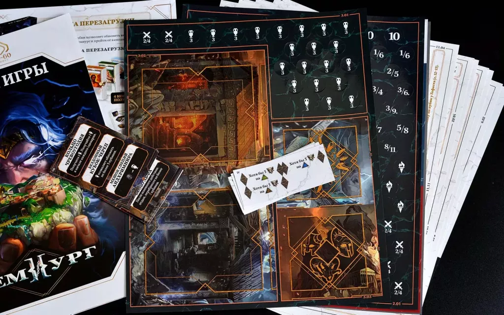 В «Демиурге» игроки выступают в роли полубогов, наблюдающих и вмешивающихся в схватку двух великих пантеонов — древнегреческого и скандинавского. По мере прохождения кампании базовая игра меняется: вы наклеиваете стикеры, открываете новые элементы, принимаете судьбоносные решения, и ваш экземпляр «Демиурга» превращается в уникальную историю. После финального сценария многие компоненты уже не вернуться к изначальному состоянию — именно поэтому и существует «Набор перезагрузки».