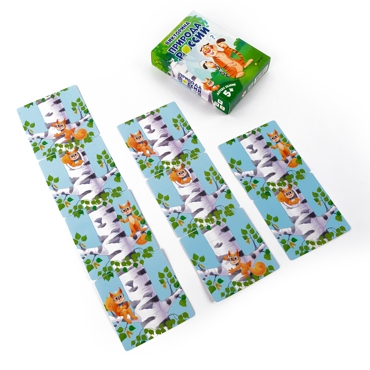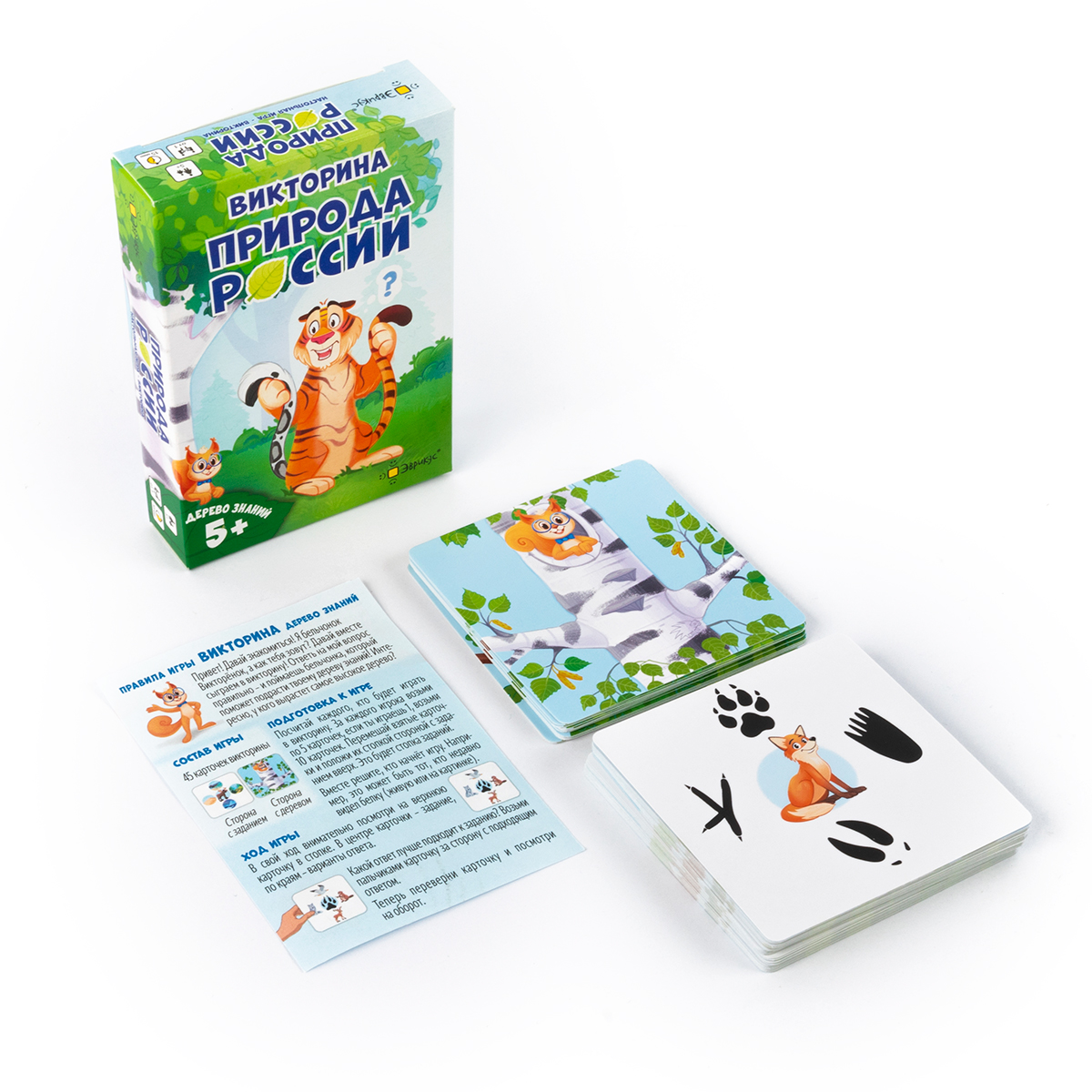 «Дерево знаний: Природа России» – настольная игра‑викторина для детей от 5 лет, посвящённая животным, растениям и природным зонам нашей страны. Ребёнок отвечает на вопросы о флоре и фауне России, климате и временах года, а за правильные ответы собирает карточки и выращивает своё дерево знаний.