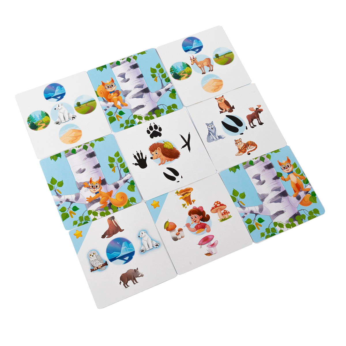 В центре каждой карты — картинка‑задание про природу России: где обитает тот или иной зверь, чем он питается, какие следы оставляет, какие растения растут в разных регионах и чем они отличаются, а также вопросы про климат и времена года. По краям размещены картинки‑ответы, и игрок должен логически установить связь между заданием и правильным вариантом.