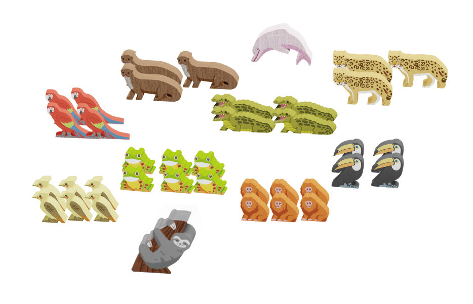 Особое внимание в игре уделено разнообразию фауны Амазонии. В коробке представлены яркие деревянные фигурки гигантских выдр, каиманов, ягуаров, туканов, тамаринов, дятлов и древесных лягушек, а также отдельных уникальных животных — от ленивца и броненосца до амазонского дельфина и анаконды. Каждое животное связано с определённым типом местности и даёт свои преимущества при правильном размещении. Подбор сочетаний видов, учёт их потребностей и возможностей — важная часть стратегии, которая напрямую влияет на эффективность построенной вами экосистемы и итоговый результат партии.​