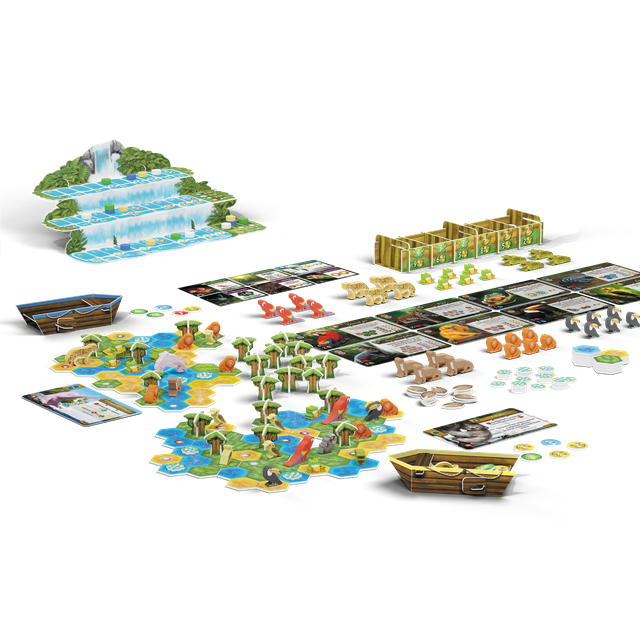 Компоненты игры радуют качеством и вниманием к деталям. Объёмные лодки для сбора жетонов, фигурки животных, множество тайлов местности и аккуратно оформленный блокнот для подсчёта очков делают игровой процесс визуально насыщенным и удобным. Большое количество жетонов и деревьев помогает наглядно увидеть, как меняется экосистема по мере партии, а памятки игроков облегчают освоение правил и напоминание ключевых действий. Всё это вместе создаёт ощущение «живых» джунглей, которые постепенно оживают под вашим управлением.​