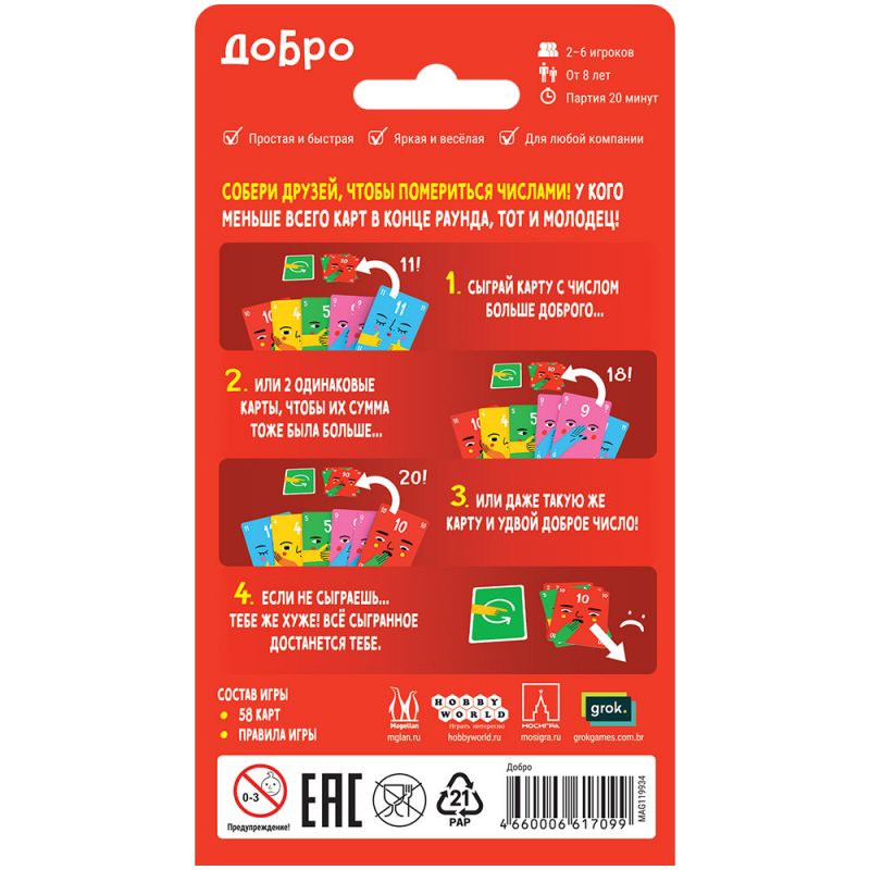 Собери друзей, чтобы помериться числами! У кого меньше всего карт в конце раунда, тот и молодец!
