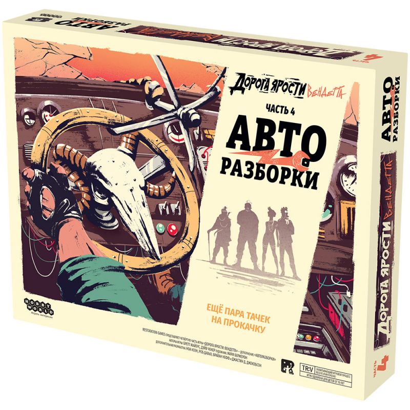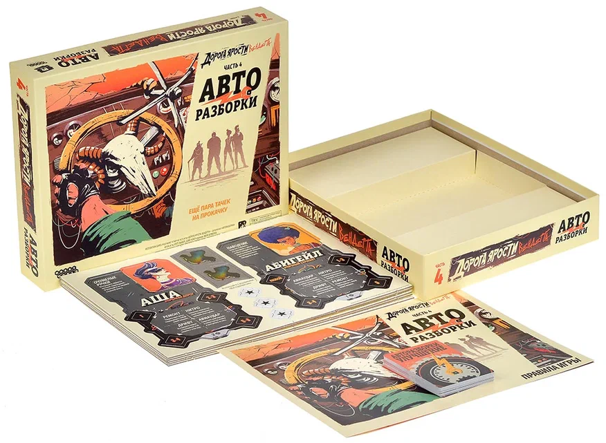 «Дорога ярости: Вендетта. Авторазборки» — дополнение к гоночной игре на выживание, которое делает банды гонщиков более характерными и асимметричными. Если базовая «Дорога ярости: Вендетта» уже предлагает динамичные заезды по постапокалиптической трассе, где машины сталкиваются, таранит друг друга и стреляют, то с этим набором за рулём каждой банды появляется свой главарь, а техника получает доступ к тюнингу. Теперь гонка — это не только про удачные броски и манёвры, но и про грамотный выбор способностей и улучшений.