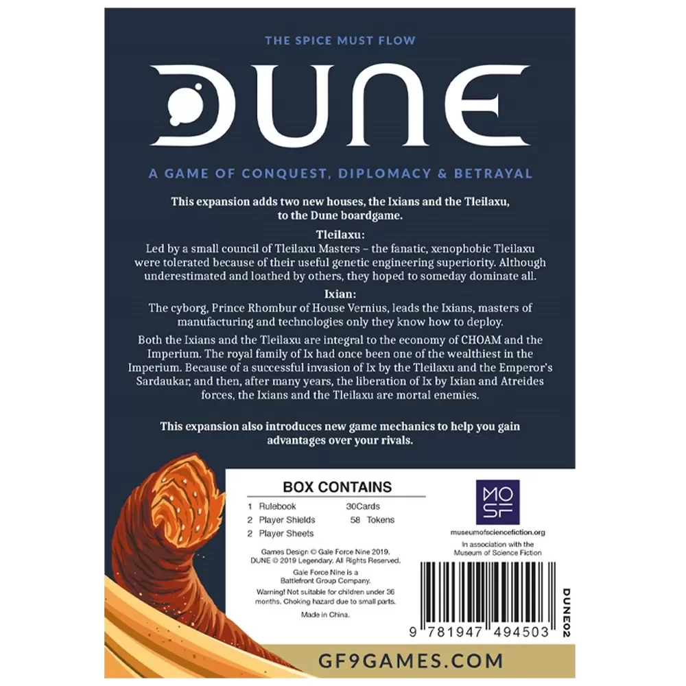«Дюна. Иксианцы и Тлейлаксу» – дополнение к настольной игре «Дюна (2019)», которое расширяет конфликт на Арракисе двумя новыми фракциями и дополнительными колодами. В игру вступают Иксианцы – мастера передовых технологий, и Тлейлаксу – загадочный дом, контролирующий аксолотль‑баки и генетические эксперименты. Дополнение усиливает асимметрию, добавляет новые карты предательства и уловок и делает борьбу за Пряность и крепости ещё более непредсказуемой.