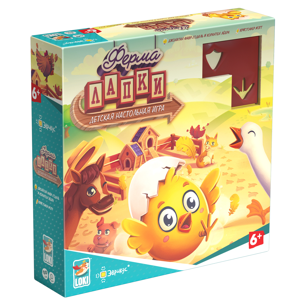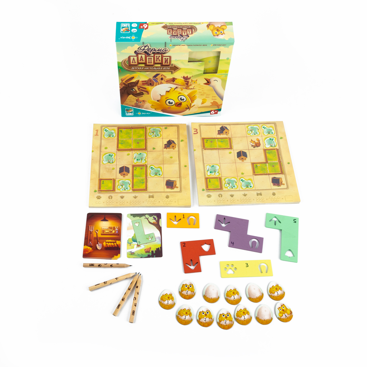 «Ферма Лапки» — это яркая детская настольная игра, где каждый игрок становится фермером и обустраивает собственный двор, рисуя следы животных по трафаретам. Вместо привычных фишек и фигурок здесь используются деревянные шаблоны и карандаши, а поле – это лист из блокнота с изображением фермы, пруда, загона, курятника и других зон. Игра в лёгкой форме развивает у детей пространственное мышление, внимание и умение планировать ходы вперёд.