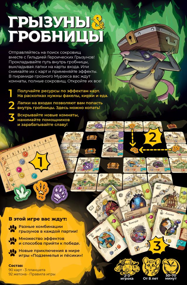 «Грызуны и гробницы» — семейная настольная игра, которая отправляет вас на археологические раскопки в пирамиду грозного Мурзеса вместе с Гильдией Героических Грызунов. Игроки берут под контроль отряды отважных мышей и крыс, пробирающихся по древним коридорам, собирают ресурсы и вскрывают комнаты, полные сокровищ. Партия длится около 50–70 минут и рассчитана на 2–3 человек от 8 лет, поэтому игра хорошо подходит для вдумчивых семейных посиделок и приятных вечеров с детьми школьного возраста.​