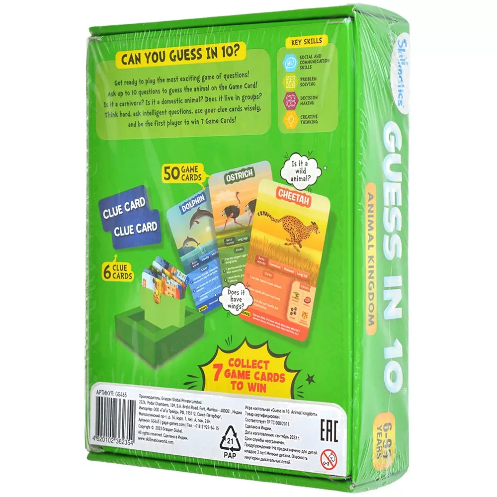 Особенность Guess in 10: Animal Kingdom в том, что вся игра полностью на английском языке. Это не только слова на карточках, но и вопросы, которые игрокам предлагается озвучивать по‑английски, что превращает партию в живую языковую практику. Игра отлично подойдёт для занятий в языковых клубах, дополнительных уроков, домашнего изучения языка и просто для семейных вечеров, когда родители хотят совместить игру и обучение. Даже взрослые нередко узнают новые факты о животных и тематическую лексику, а дети с интересом подключаются к обсуждению.