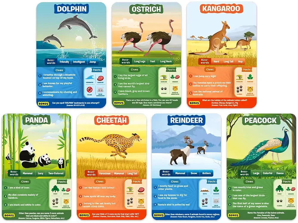 Игровая цель проста и понятна: стать первым, кто сможет набрать определённое количество отгаданных карт (например, семь), или просто устроить серию раундов «ради удовольствия» и тренировки. Подсказочные карты помогают выбрать направление вопросов, когда игроки заходят в тупик, а бонусные задания поощряют тех, кто задаёт точные и логичные вопросы. Такая структура делает игру одновременно развлекательной и обучающей: дети учатся классифицировать животных по признакам, делать выводы и аккуратно подбирать формулировки.