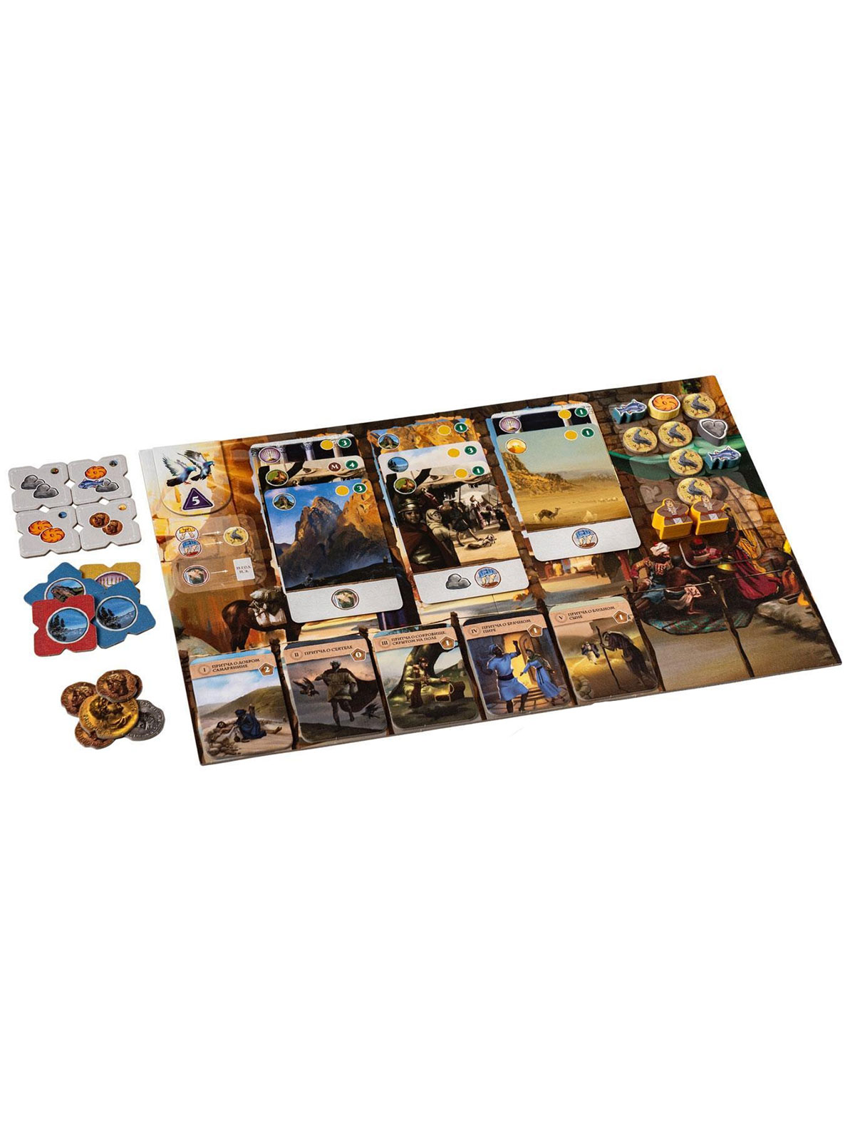 Геймплей строится вокруг розыгрыша карт и взаимодействия с локациями Иерусалима. Игрок выкладывает карту на свой планшет и получает цепочку действий: сначала срабатывает действие локации, затем действие последователя. В пустыне добывается камень, в озере — рыба, в горах — хлеб; храм позволяет отправлять последователей в нужные зоны, чтобы усилить будущие сборы, а рынок даёт возможность продавать, покупать и получать особенно эффективные карты. Так вы выстраиваете экономику, без которой не получится претендовать на лучшие места за столом.