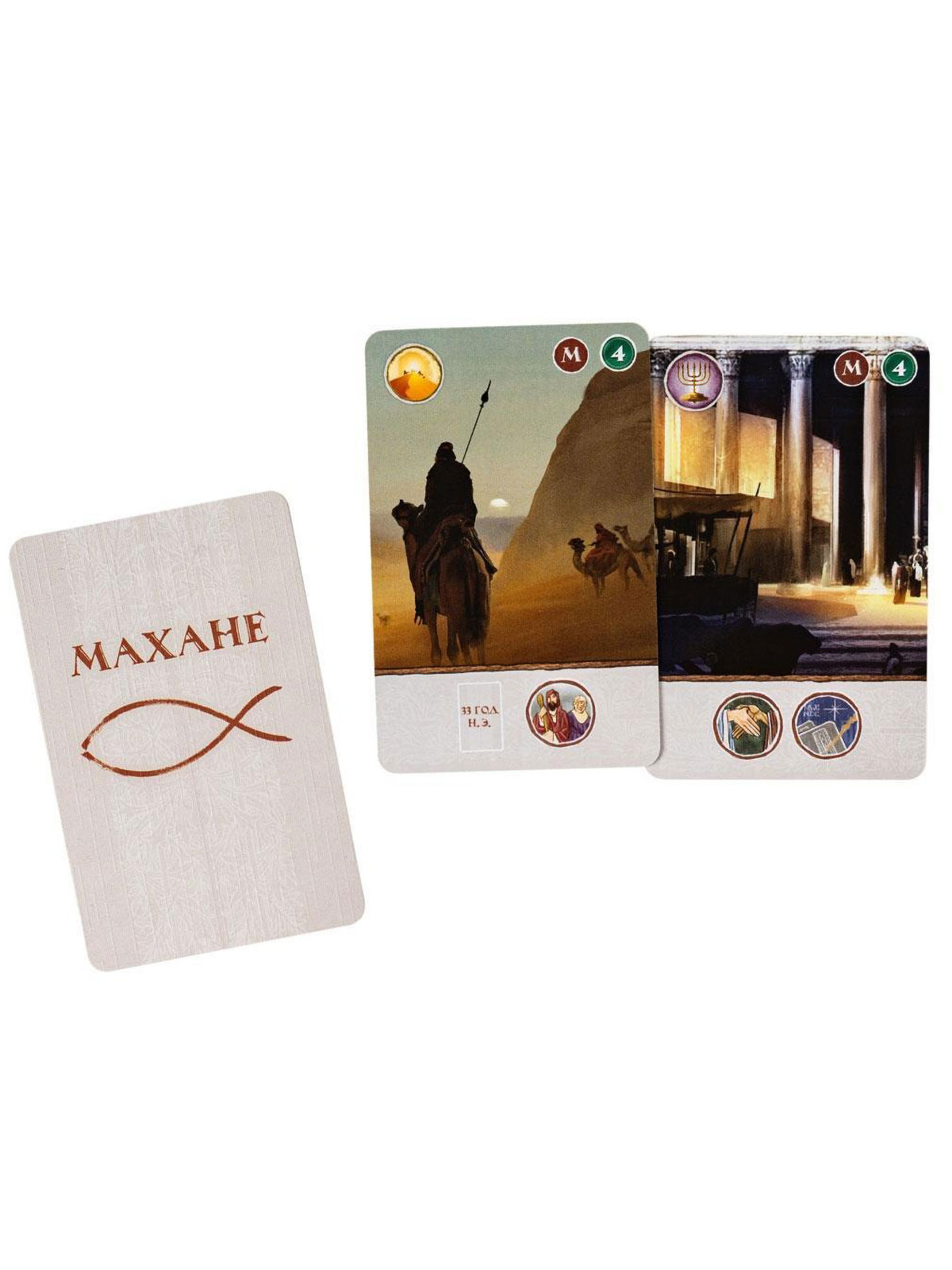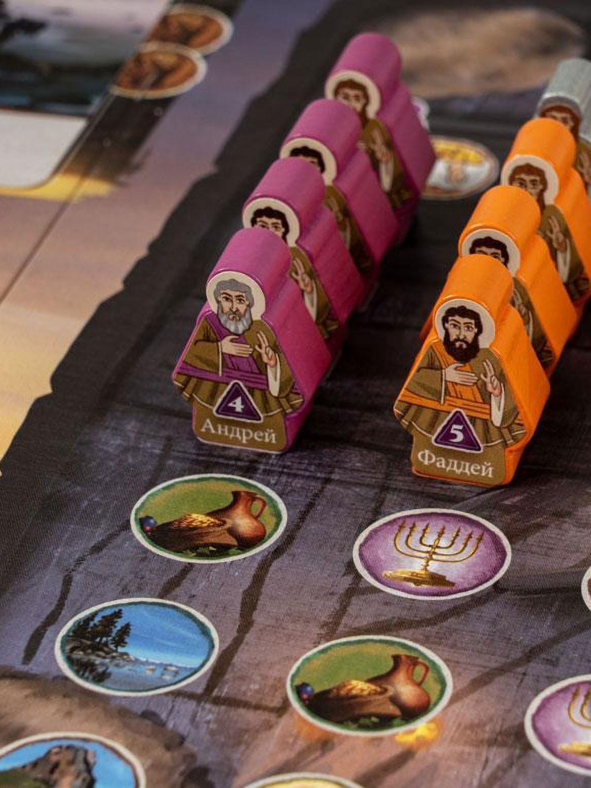 Во второй части хода включаются сами последователи. Они могут слушать притчи, вновь посещать храм или рынок, совершать благодеяния другим игрокам или отправляться напрямую к Тайной вечере. Важная фишка игры — разыгранные карты не уходят в сброс, а остаются на планшете, формируя постоянный «движок» действий. Это тот самый «колодострой без колодостроя»: вы не тасуете колоду, а строите цепочки эффектов прямо на столе, и порядок выкладки карт приобретает критическое значение. Собрав удачную комбинацию, вы сможете посещать двенадцать апостолов, усаживать их за общий стол и получать мощные награды.