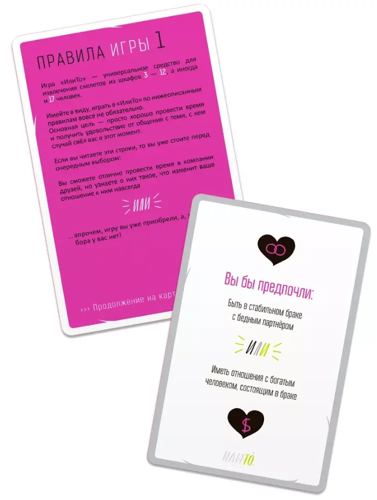 По сути, «ИлиТо Спорно» — это смесь карточной игры и откровенной беседы. Каждая карта предлагает непростой выбор из двух неприятных, странных или просто очень интимных вариантов. Игрокам приходится решать, какое «меньшее зло» они предпочли бы, а главное — объяснить свой выбор так, чтобы убедить ведущего. Правильных ответов здесь не существует: важно лишь, насколько ярко и убедительно вы аргументируете свою позицию.