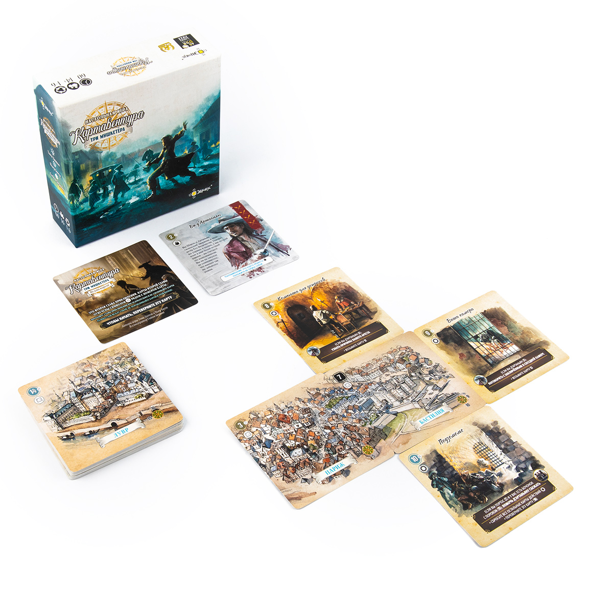 «Картавентура. Три мушкетёра» — настольная повествовательная игра из серии «Картавентура», в которой вы проживаете собственную версию истории знаменитых мушкетёров. Вместо привычного чтения романа вы сами принимаете ключевые решения, определяете ход событий и приходите к одной из нескольких возможных развязок, проходя историю в формате карточной настолки.