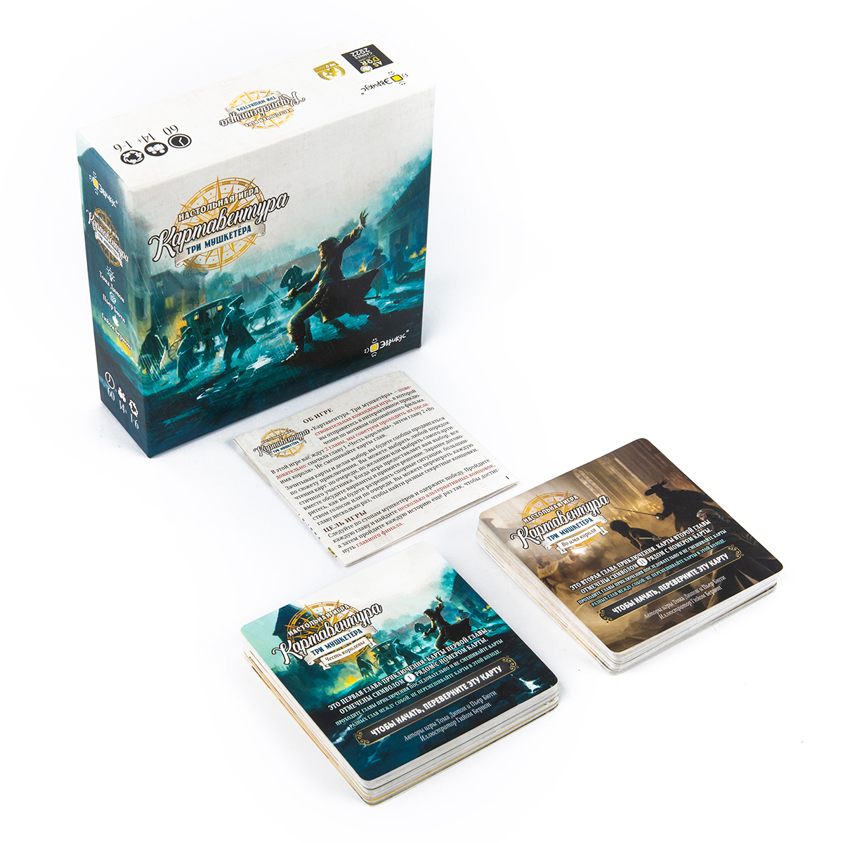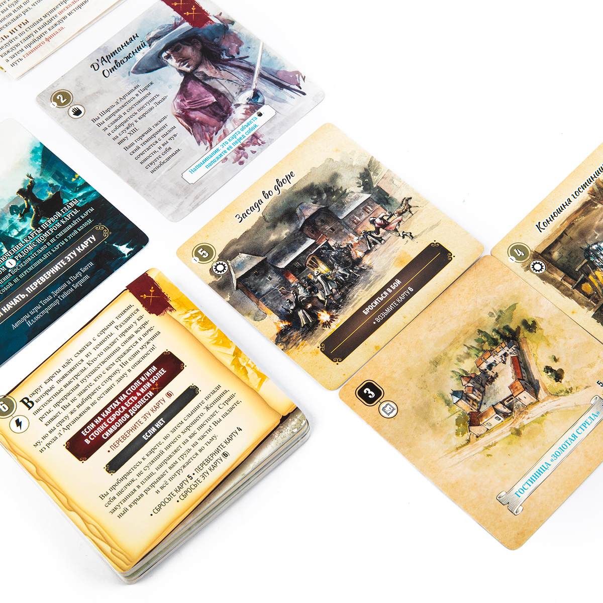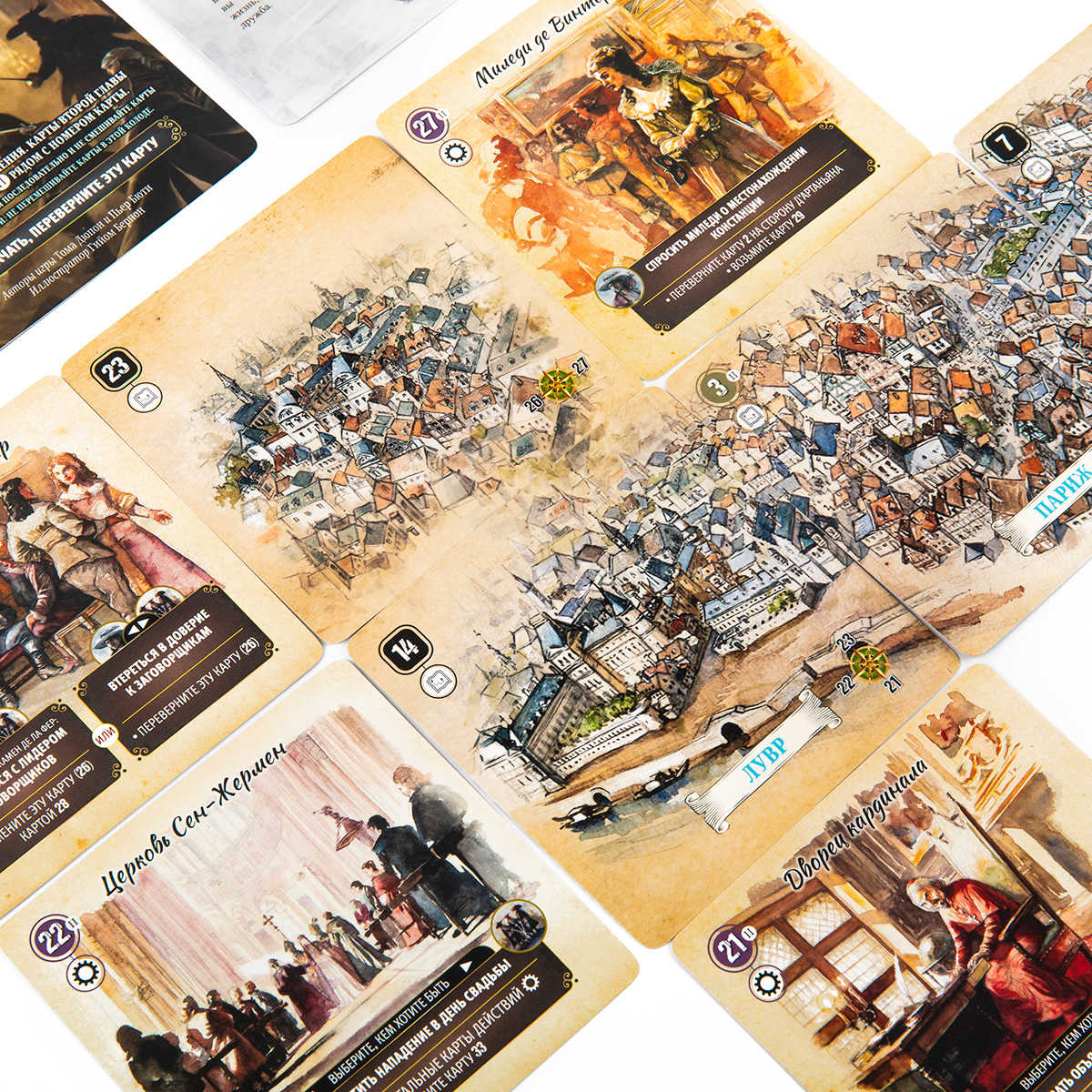 Тематика игры — приключенческая и историческая. В коробке вы найдёте дополнительный буклет с исторической справкой о времени, в которое вас переносит сюжет: Франция времён кардинала Ришельё, придворные интриги, дуэли, честь и долг. Это делает игру не только развлекательной, но и познавательной: после партии хочется перечитать роман или посмотреть экранизацию, чтобы сравнить свой «путь» с классической историей.