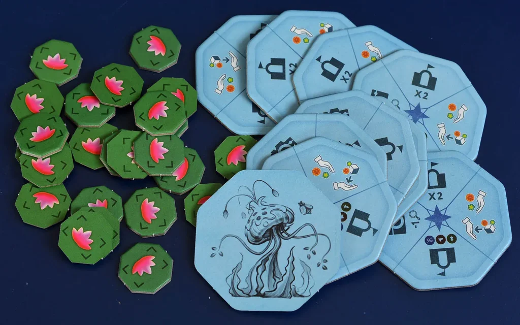 Комплектация дополнения довольно компактна, но при этом функциональна: 17 карт растений задают набор уникальных эффектов и квестов, 16 фишек растений и 24 жетона квестов позволяют отслеживать прогресс, а 10 жетонов усиления действий дают тактические «ускорители» в нужные моменты партии. Четыре памятки помогают быстро освоиться с новыми элементами, а отдельные правила дополнения коротко и структурированно объясняют все изменения.