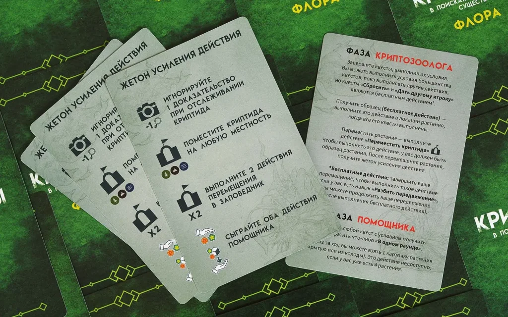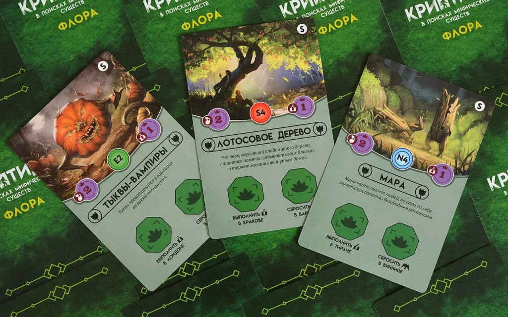 Дополнение вводит в игру новый пласт задач – карты растений и квесты, связанные с ними. Каждый экземпляр мифической флоры – это отдельная карта с описанием и специальным заданием, которое нужно выполнить, чтобы заполучить растение и его эффект. Темы квестов привязаны к уже знакомым механикам базы: вам могут понадобиться определённые типы доказательств, успехи в отслеживании криптидов, нужное расположение тайлов в заповеднике или выполнение конкретных контрактов. Таким образом, «Флора» аккуратно вплетается в существующую структуру партии, не ломая её, а добавляя новые цели и приоритеты.