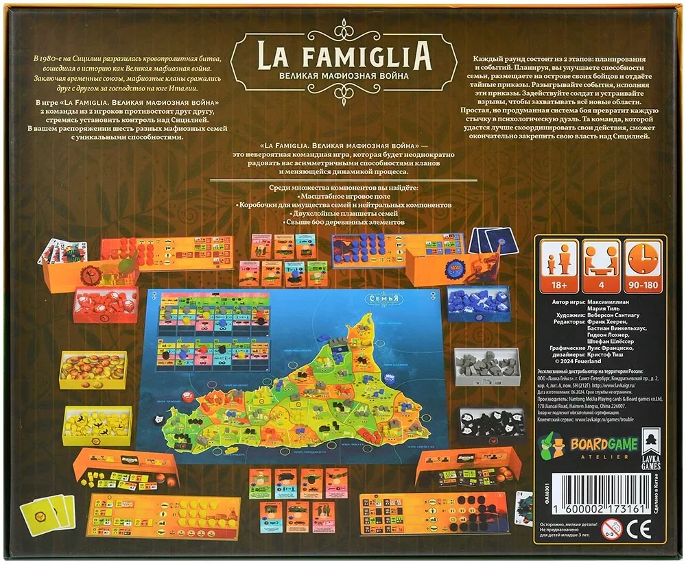 La Famiglia — тяжёлая стратегия с заявленным временем партии около 180 минут и возрастным рейтингом 16+ или даже 18+ по версии локализатора. Игра требует от команды плотного общения, долгосрочного планирования и готовности к жёсткому конфликту: здесь много прямых столкновений, «подстав» и холодных расчётов, а каждая ошибка может стоить целого региона.