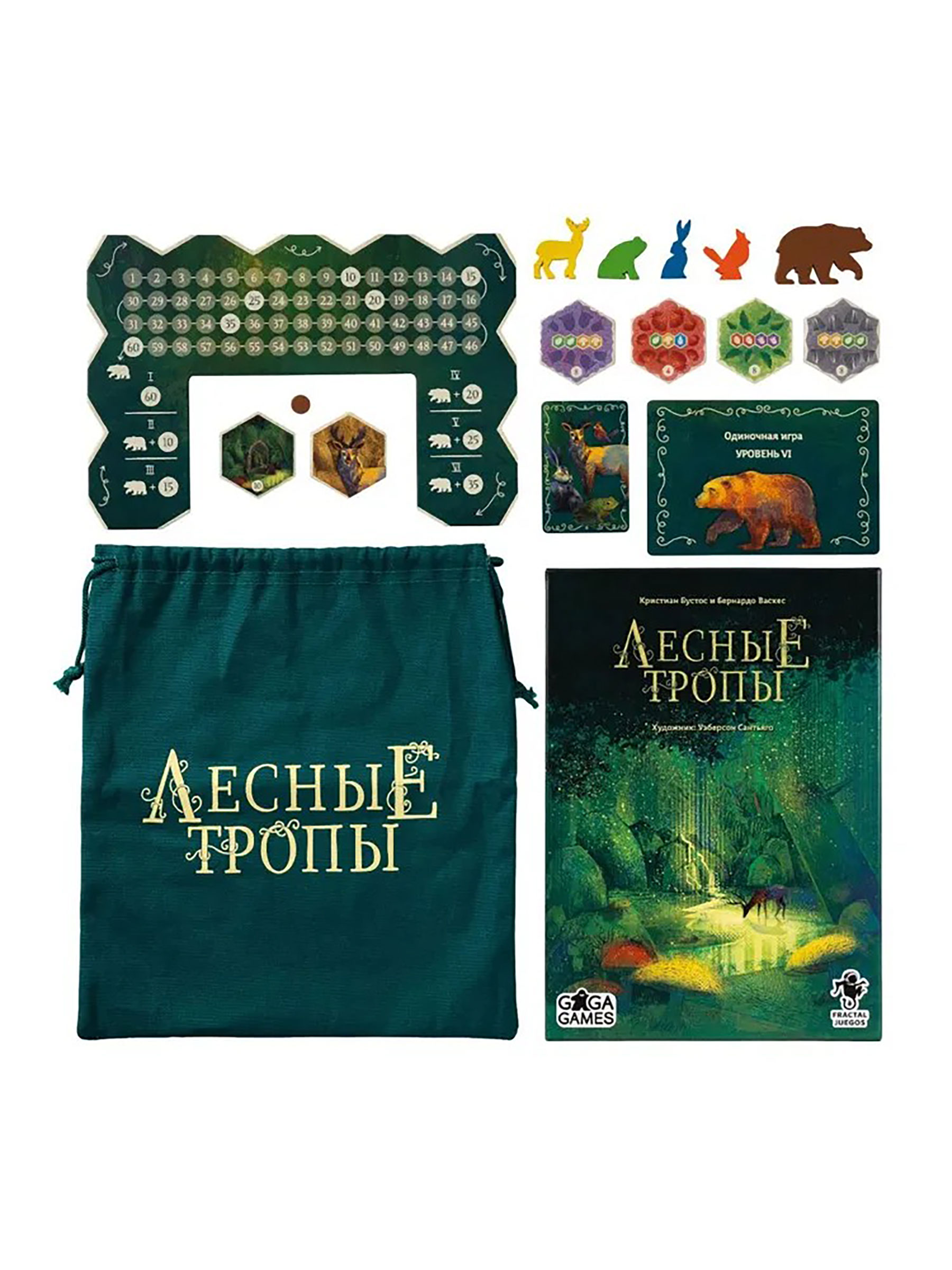 Компоненты выполнены очень качественно: плотные шестиугольные тайлы выдержат множество партий, а объёмные деревянные фигурки животных приятно смотреть и передвигать по полю. Акварельные иллюстрации создают ощущение сказочного леса — прогулка по тропинкам визуально не менее привлекательна, чем сама механика. Игра подходит для тихого семейного вечера, серьёзного соревнования за очки или расслабленного «пасьянса» в одиночку — она гибко подстраивается под настроение и компанию.