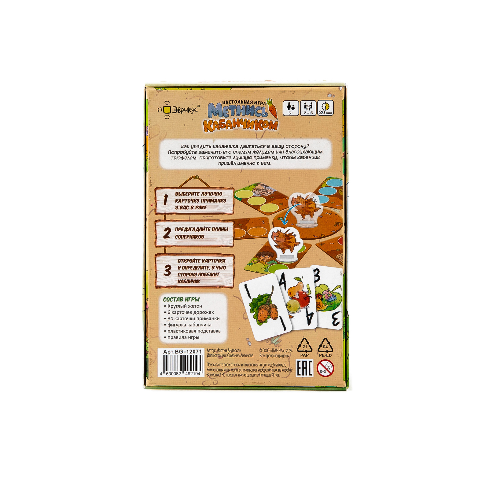 «Метнись кабанчиком» — это азартная семейная игра, в которой вам предстоит играть карточки с разными приманками, чтобы кабанчик пошёл именно к вам. Спелый жёлудь, благоухающий трюфель, сочная морковь, а может быть портрет милой кабанихи - что приглянется пока еще дикому зверю? Выбирайте с умом и приручите кабанчика первым!