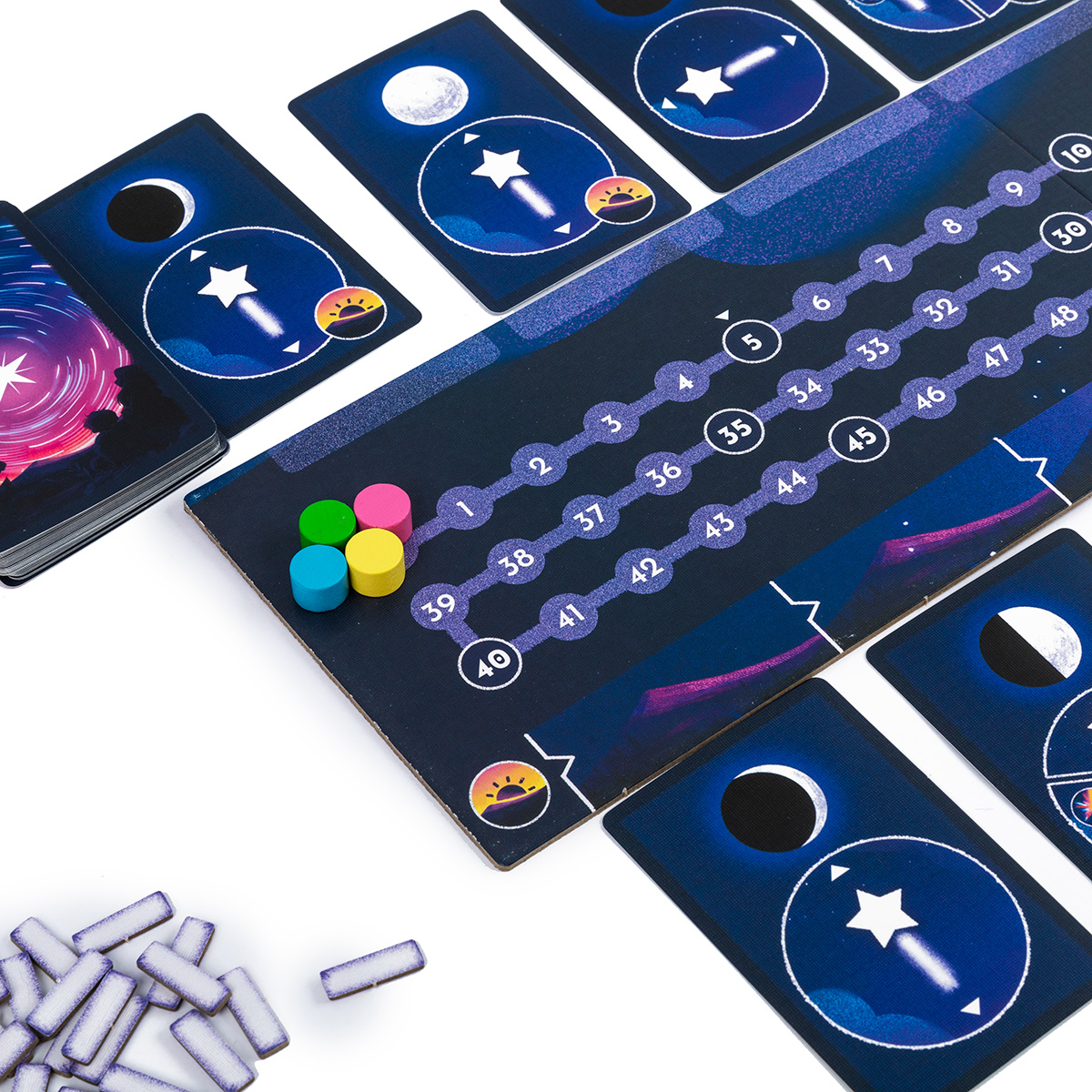 Перед началом партии вы собираете модульное поле из шести частей, образующих звёздное небо, и обрамляете его рамкой из пяти фрагментов с фазами Луны. Затем каждый игрок выбирает цвет и получает 35 звёзд этого цвета, а также памятку, фишку подсчёта очков и набор личных целей. Рядом с каждой фазой Луны выкладывается по одной карте общей цели, так что в каждом секторе рамки закреплено своё задание.