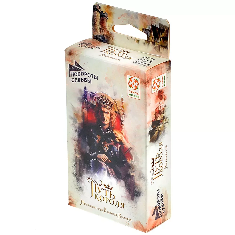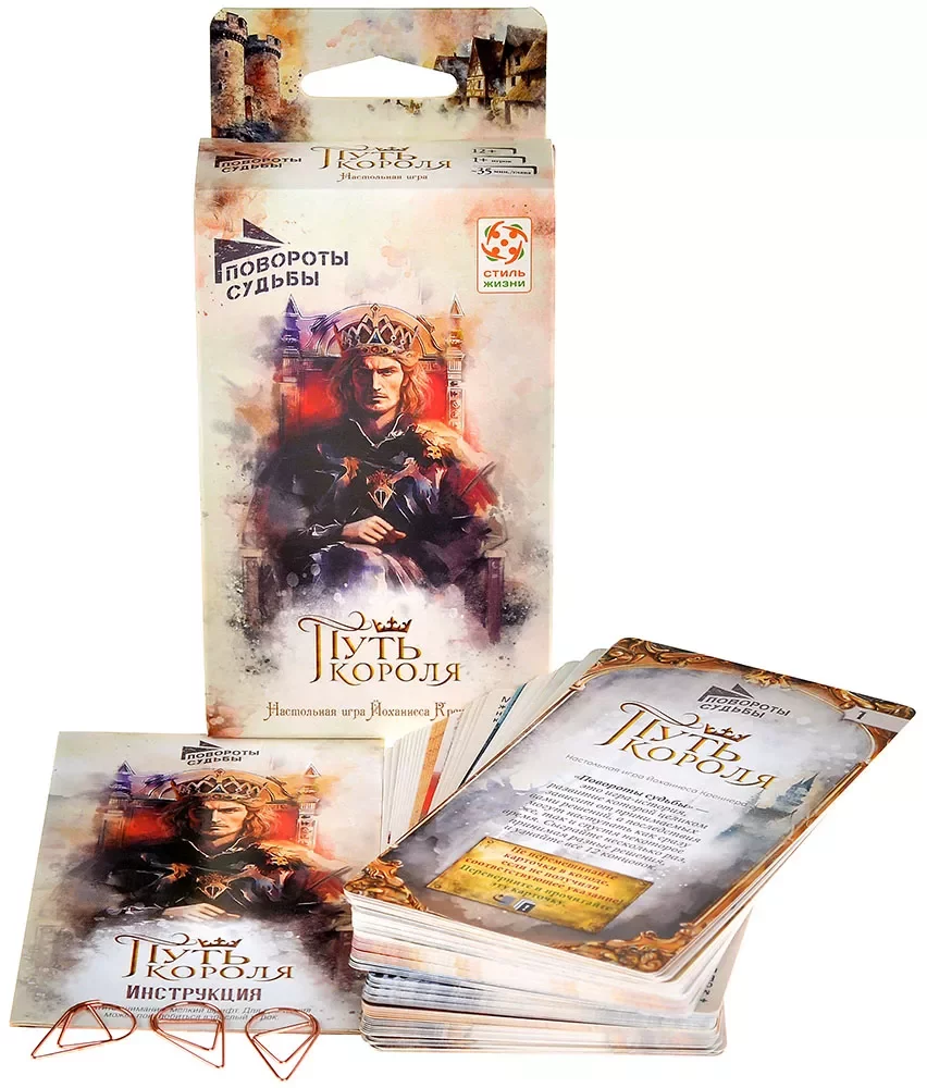 «Повороты судьбы: Путь короля» рассчитана прежде всего на одного игрока, рекомендованный возраст — от 14 лет, а средняя партия занимает около 45 минут. Правила несложные, акцент сделан на чтении и выборе, поэтому игра напомнит интерактивный роман или игру-книгу, но в более компактном, карточном формате. Благодаря атмосферным иллюстрациям в технике акварели и продуманной подаче текста вы легко погружаетесь в мир средневекового королевства, где от одних и тех же ситуаций можно прийти к очень разным судьбам.