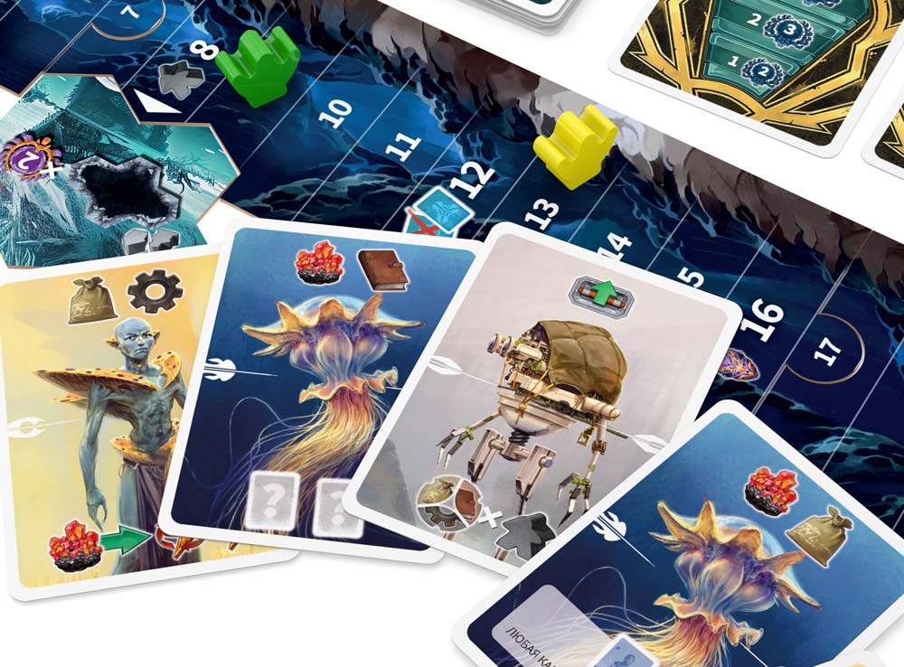 Сюжет расширяется: племена встречают зов бездны, открывая подводные тайны и новые земли. Базовые колоды дополняются: 9 новыми жителями, 16 медузами (мощные эффекты), 18 картами путешествий. Строите рядом с озёрами (3 тайла), используйте шлюзы (5 шт.), модули (9 жетонов) и пиявок (8 шт.). Трек почтения отслеживает прогресс, гаджеты и циркадный жетон добавляют тактики.
