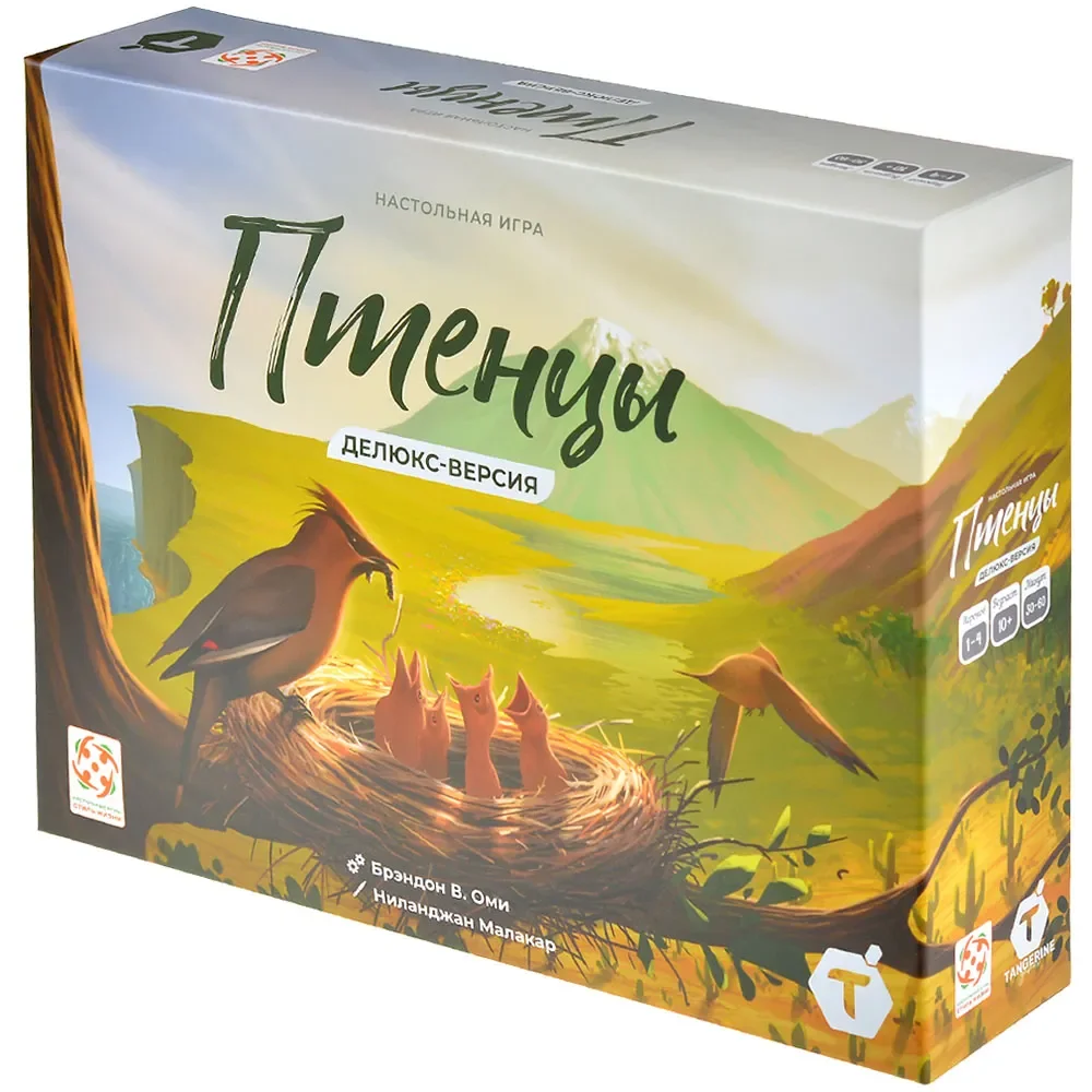 Делюкс-версия «Птенцов» отличается улучшенными компонентами. В комплект входят 3D‑фигурки птиц, дополнительно к деревянным миплам, шесть пластиковых органайзеров, удобный лоток для броска кубиков и увеличенное количество жетонов и аксессуаров, делающих игру более наглядной и приятной на столе. За счёт объёмных фигурок и множества цветных сегментов биомов поле в конце партии выглядит как яркая карта экосистем с живыми птицами и богатым кормом.
