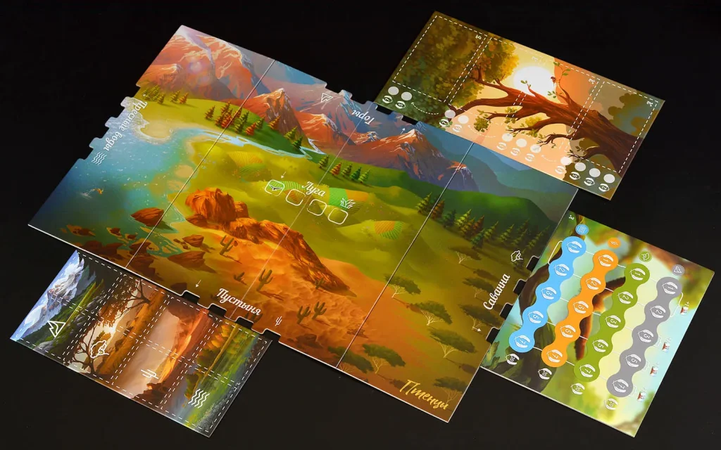 Отдельный слой решений связан с сегментами биомов. На планшетах игроков постепенно складывается собственная карта, отражающая освоенные экосистемы; от того, какие сегменты вы добавляете и как их комбинируете, зависят дополнительные бонусы и возможности получения очков. Некоторые цели требуют иметь определённые сочетания биомов и кормов, другие – превосходства в конкретном типе ресурсов или территорий, что подталкивает к разной стратегии в каждой партии.