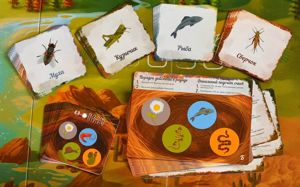 Корм представлен жетонами разных типов – насекомые, семена, рыба и другие виды провизии, характерные для конкретных биомов. Собирая эти жетоны, вы не просто пополняете запас пищи, но и формируете наборы, необходимые для кормления птенцов и выполнения целей. На личном планшете каждый игрок размещает сегменты биомов и собранные жетоны так, чтобы закрывать условия карт целей и получать за это победные очки.