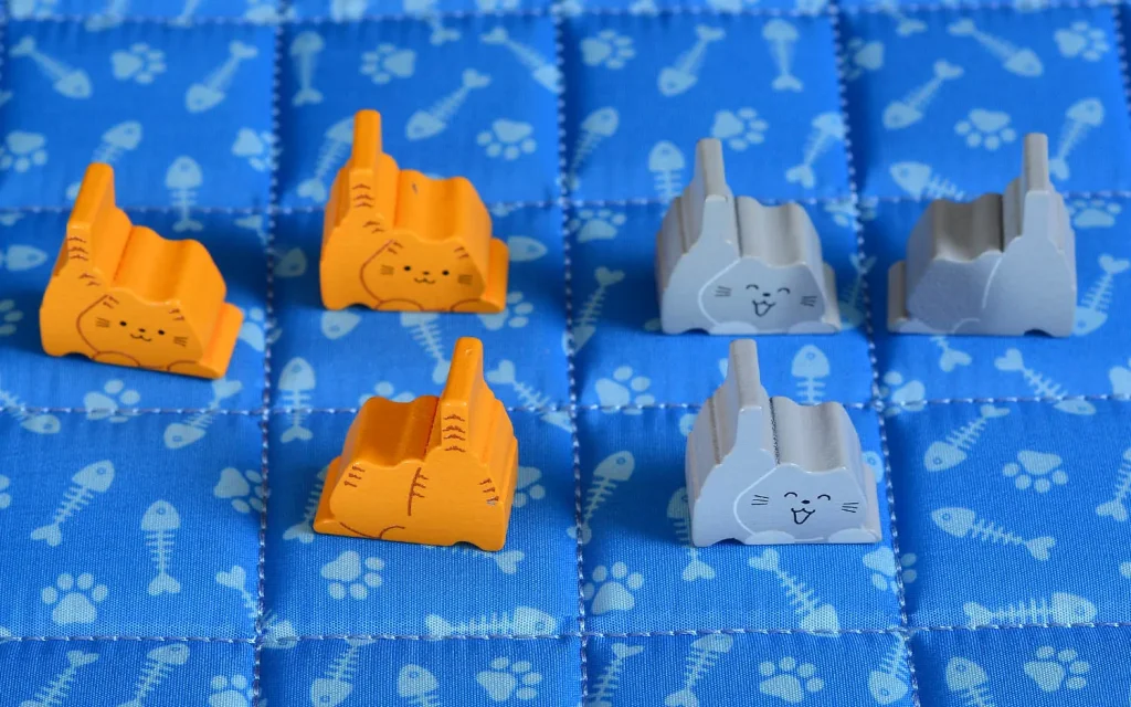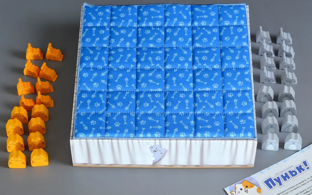 В начале партии игроки переворачивают дно коробки и накрывают его специальным игровым полем‑одеялом – оно и станет ареной для будущего пушистого противостояния. Каждый участник выбирает свой цвет и получает набор фишек: 8 котят и 8 взрослых котов, причём взрослые коты поначалу недоступны. Первый ход достаётся тому, кто последним гладил кота, что сразу задаёт лёгкий и дружелюбный тон партии.