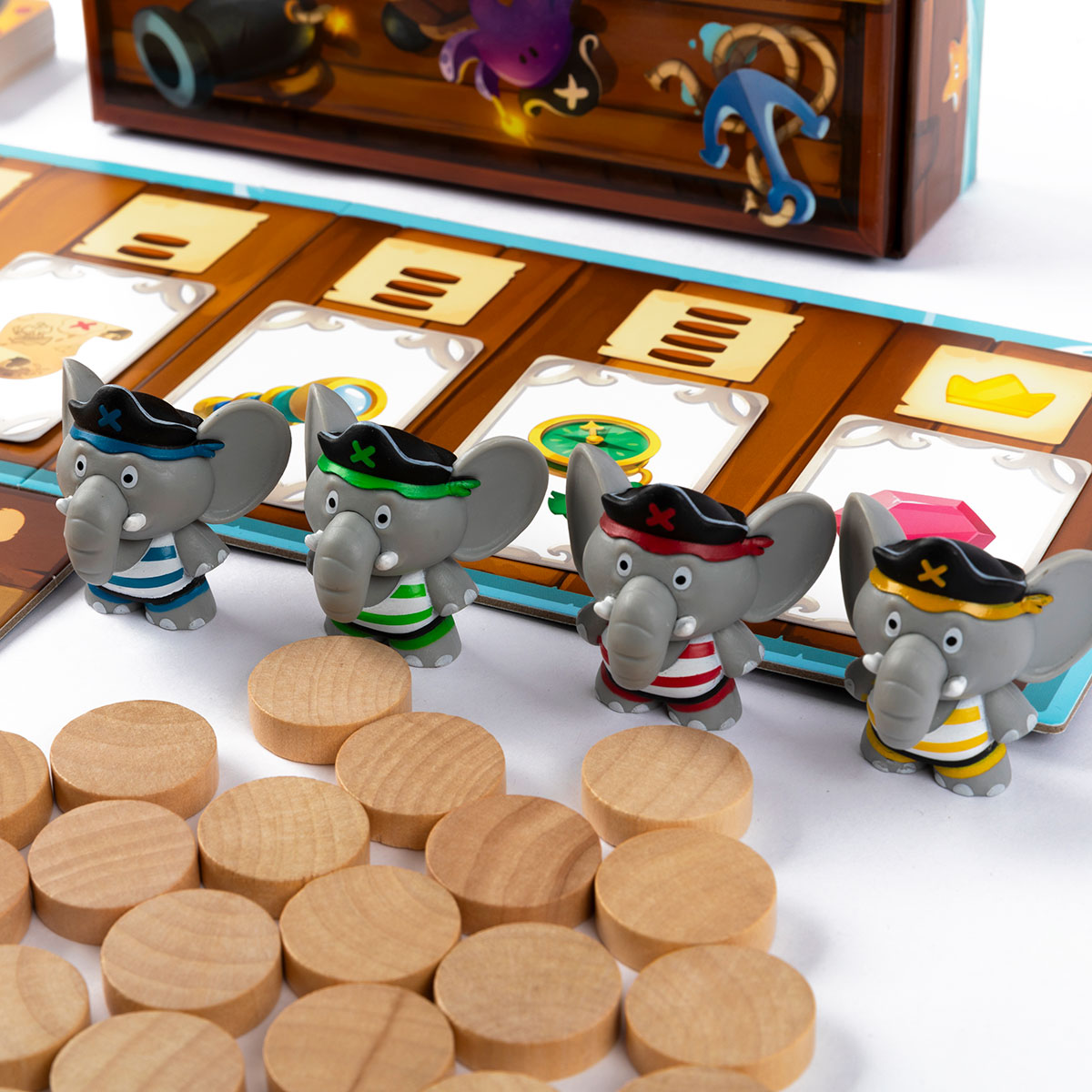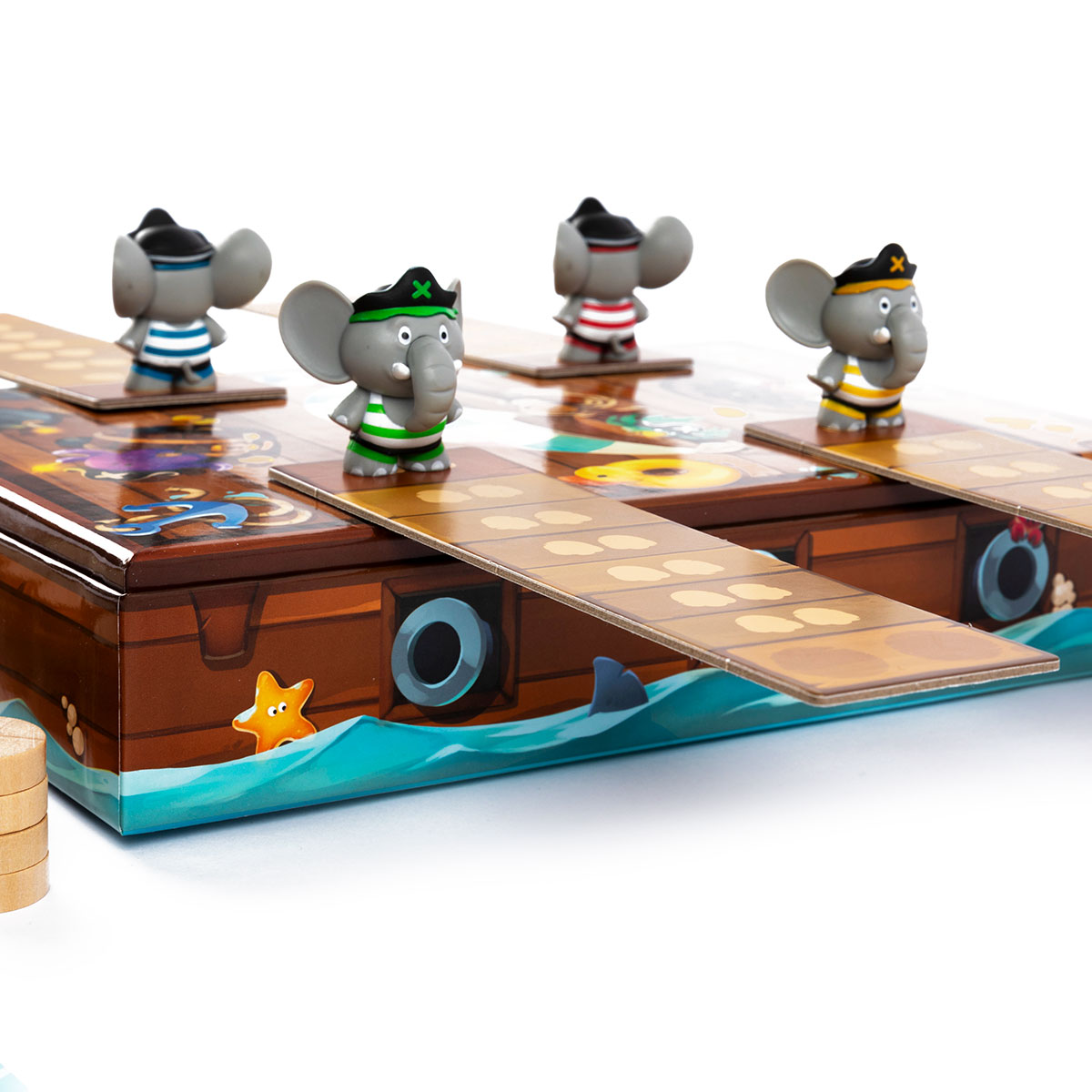 «Слоны-пираты» – динамичная детская настолка, в которой каждый игрок управляет забавным слоном-пиратом, рискующим ради сокровищ на палубе корабля капитана Жирафа. По сюжету вы – команда смельчаков, решивших стащить как можно больше сокровищ с пиратского корабля, но любое неверное движение может закончиться падением в воду. В игре много смеха, шума и эмоций: дети радуются удачным открытиям, переживают за шатающиеся доски и с азартом следят, чей слон продержится дольше всех.