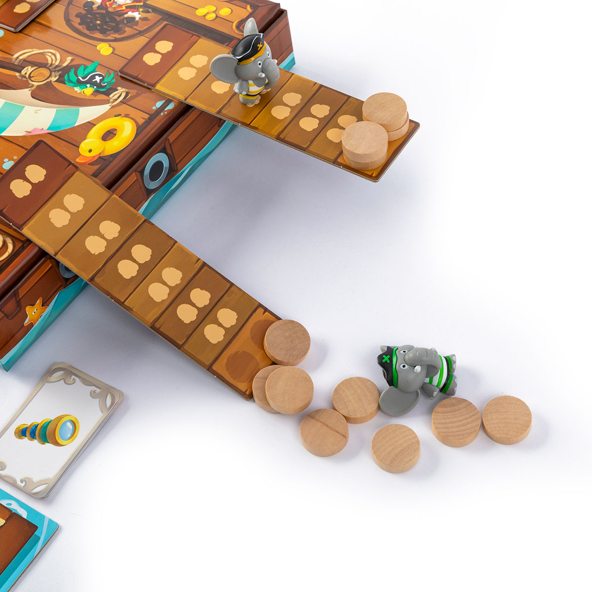 Секрет напряжения в том, что каждый удачный ход усиливает давление на соперников: за каждое уникальное сокровище они вынуждены выкладывать на свою доску один тяжёлый ящик. Чем больше ящиков на доске, тем быстрее она наклоняется – особенно когда слон подходит всё ближе к концу. Игроки постоянно балансируют между жадностью и осторожностью: остановиться сейчас и немного ослабить противников или рискнуть ради серии из пяти–шести разных сокровищ, которая буквально засыпает их доски ящиками.