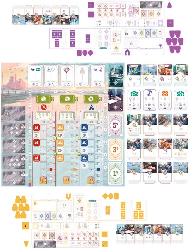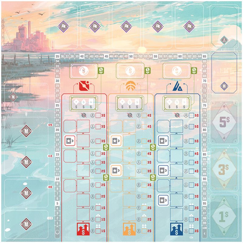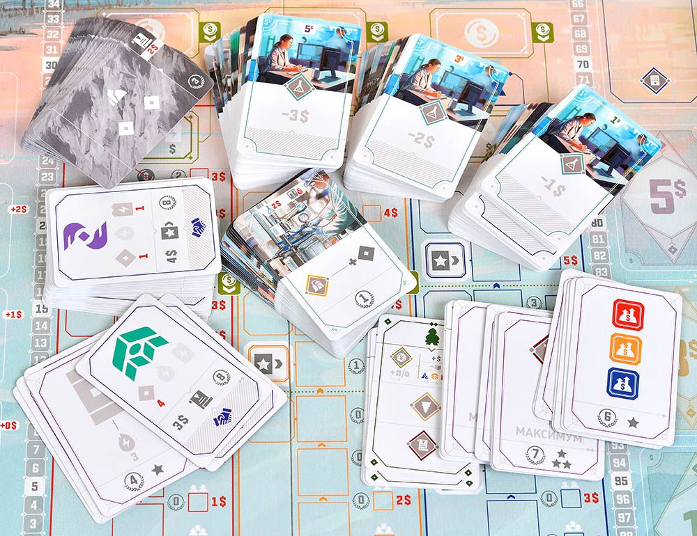 На общем поле располагаются: рынок участков, треки стоимости трёх компаний, слоты для общих целей и несколько рядов карт. В открытой выкладке доступны усовершенствования, контракты и карты денег с печатными действиями на обратной стороне. В конце раунда ряды частично обновляются, поэтому окно возможностей постоянно смещается, а доступ к нужным картам становится предметом борьбы между игроками.​