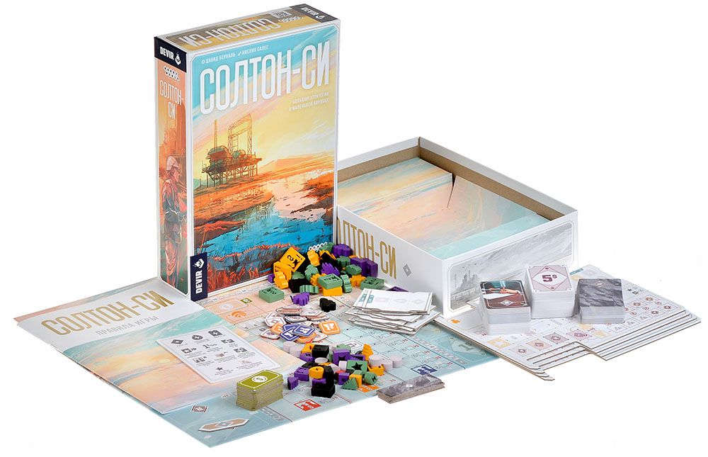 Компонентно «Солтон-Си» заметно выделяется для игры такой глубины благодаря относительно компактной коробке. Внутри при этом скрывается более двухсот карт разных форматов, несколько десятков жетонов и фишек, крупное поле и планшеты компаний, что создаёт ощущение «большой евроигры в маленькой коробке». Отдельно подчёркивается важность протекторов: в игре используется 214 карт формата 44 × 67 мм и 4 крупных карты 79 × 120 мм, которые активно тасуются и берутся в руку.​