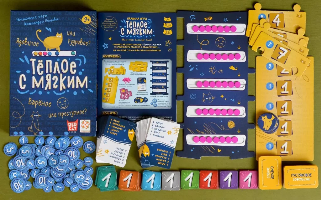 Компактный по правилам, но содержательный по ощущениям, «Тёплое с мягким» отлично работает как игра для разогрева перед более сложными настолками или как основное развлечение на вечеринки. 20–30 минут на партию, минимум подготовки (разложить поле для голосования, раздать жетоны и карты) и практически бесконечное число возможных сочетаний слов и шкал делают его удобным выбором для любых компаний 9+