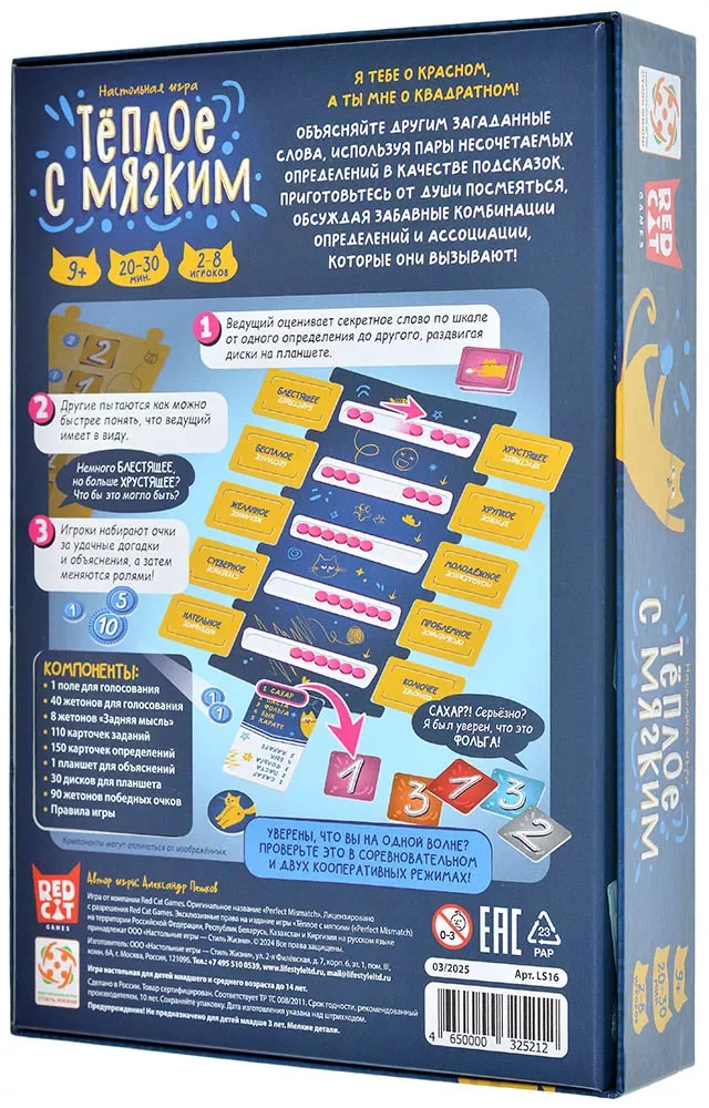 «Тёплое с мягким» – динамичная вечериночная игра на ассоциации, в которой вы будете объяснять слова не привычными подсказками, а положением на шкалах из пар странных и часто противоречивых определений. Вместо «это животное» или «это предмет» ведущий показывает, насколько загаданное слово по его ощущениям «пупырчатое» или «железное», «заразное» или «энергичное», а остальным предстоит догадаться, что имелось в виду. Партии длятся 20–30 минут, игра подходит для 2–8 участников от 9 лет и отлично заходит как в семье, так и в компании друзей.