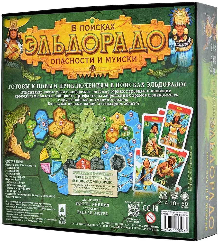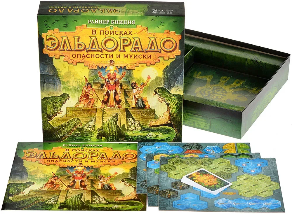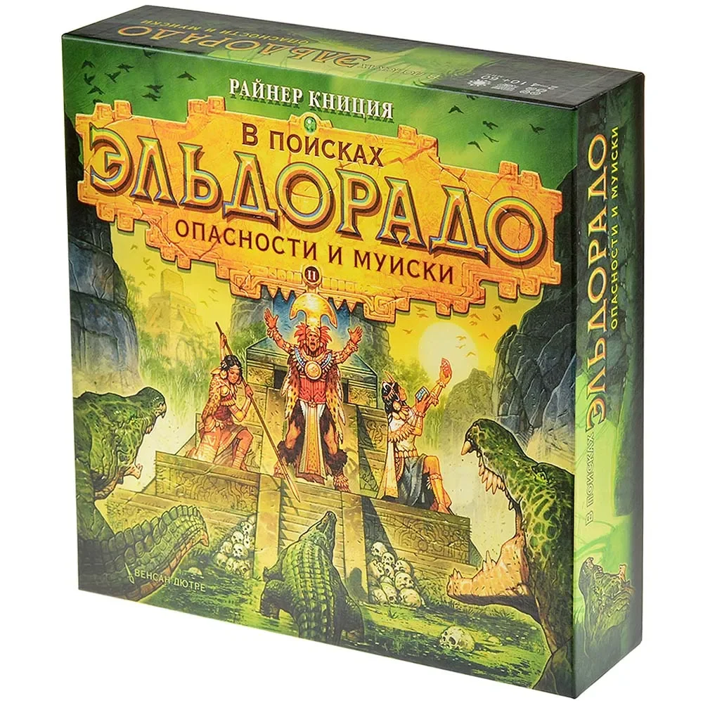 «В поисках Эльдорадо. Опасности и Муиски» — модульное дополнение к популярной гоночной настольной игре Райнера Книции «В поисках Эльдорадо». Оно создано для тех, кто уже прошёл стандартные маршруты и хочет сделать экспедицию сложнее, разнообразнее и тактической, не перегружая базовые правила. В коробке вы найдёте два самостоятельных модуля — «Опасности» и «Муиски», которые можно подмешивать к базовой игре по отдельности или использовать вместе, собирая новые конфигурации карт.