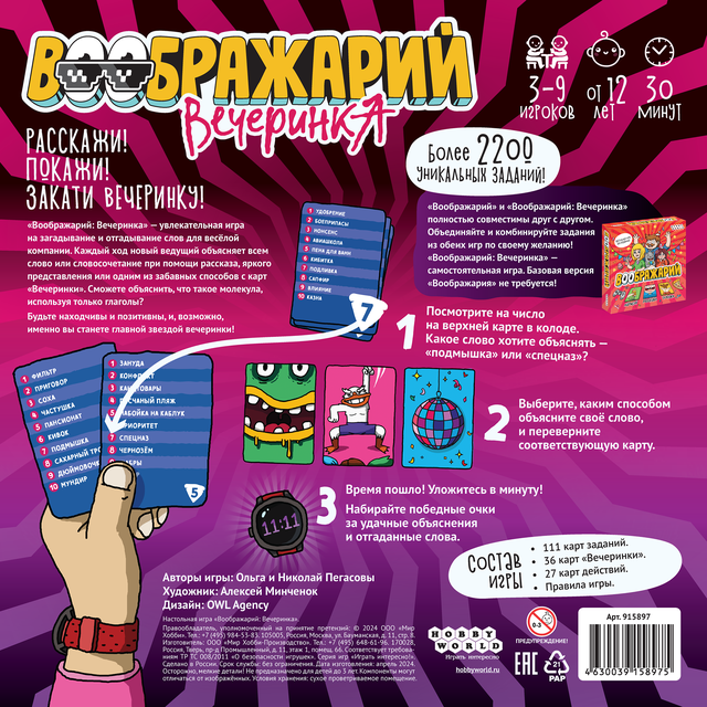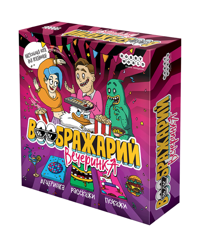 «Воображарий: Вечеринка» (издание 2024 года) — обновлённая версия популярной игры на ассоциации, созданная специально для шумных компаний и неформальных встреч. Это самостоятельная настольная игра, в которой участники объясняют друг другу слова и выражения самым разным, порой совершенно безумным образом, стараясь уложиться в ограниченное время и заработать очки. Игра рассчитана на 3–9 игроков от 12 лет и занимает около 30 минут, что делает её отличным вариантом для вечеринок, встреч с друзьями и корпоративных вечеров.​