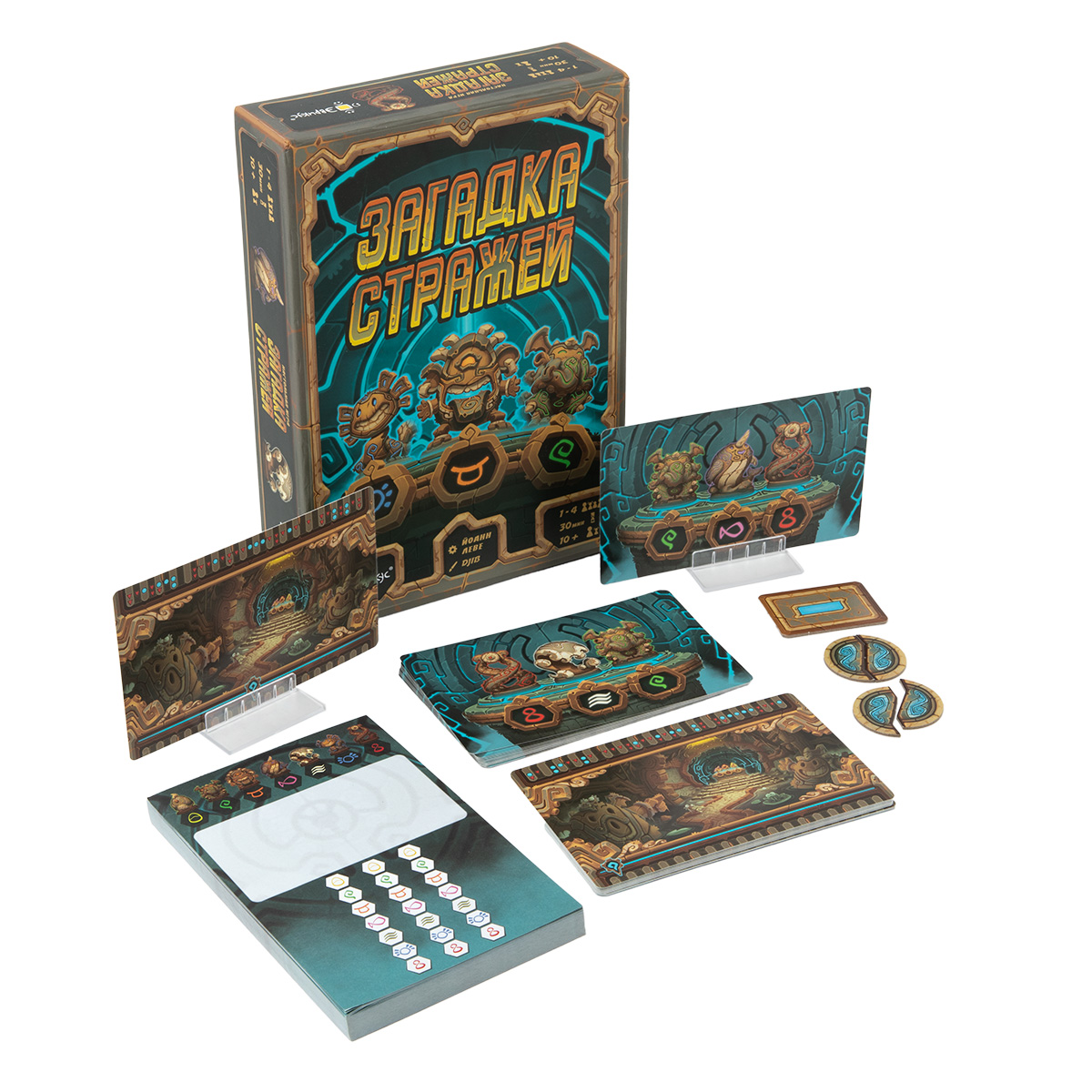 «Загадка стражей» – семейная логическая настольная игра, в которой вы отправляетесь на поиски сокровищ древнего храма, спрятанных за каменными стражами. Каждому участнику достаётся свой закрытый код – комбинация из трёх стражей, стоящих в определённом порядке, и именно эту последовательность предстоит восстановить с помощью подсказок и дедукции. Победителем станет тот, кто сумеет первым разгадать две разные комбинации и соберёт обе половины волшебного амулета, открывающего сокровищницу.