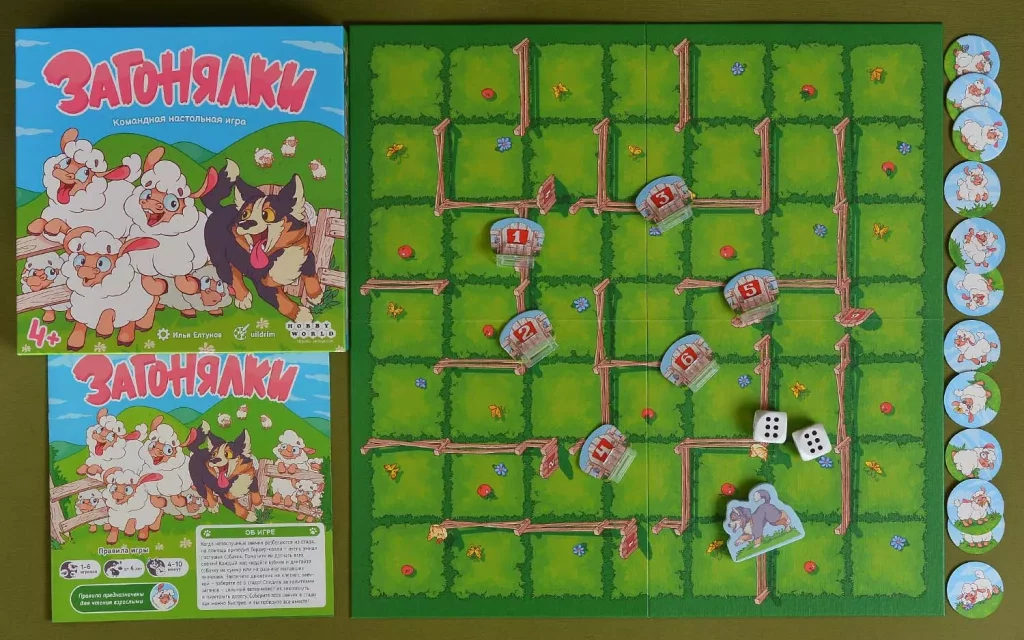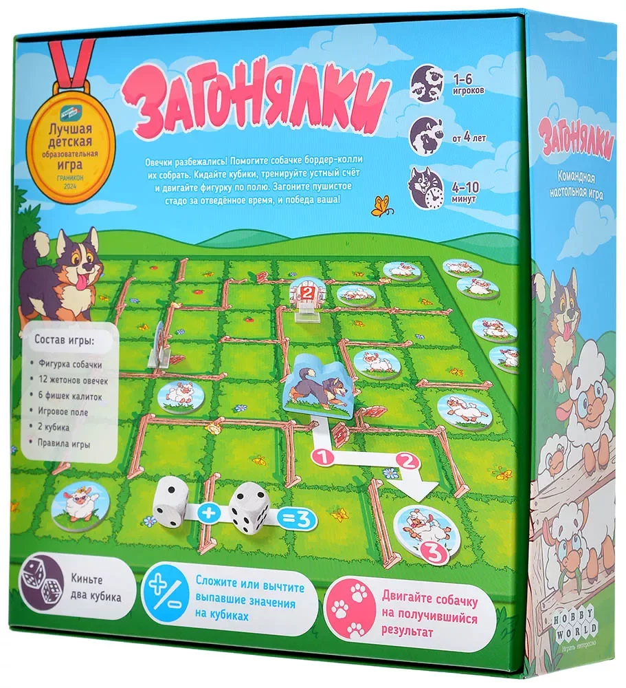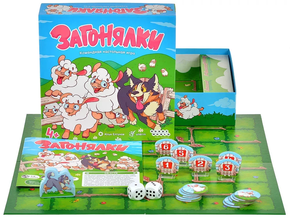 «Загонялки» — кооперативная детская игра про ловкого бордер‑колли и стайку пушистых овечек, которые разбежались по полю‑лабиринту. Игроки вместе помогают собаке собрать стадо до того, как истечёт время, используя броски кубиков, устный счёт и смекалку, чтобы найти лучший маршрут между калитками.​