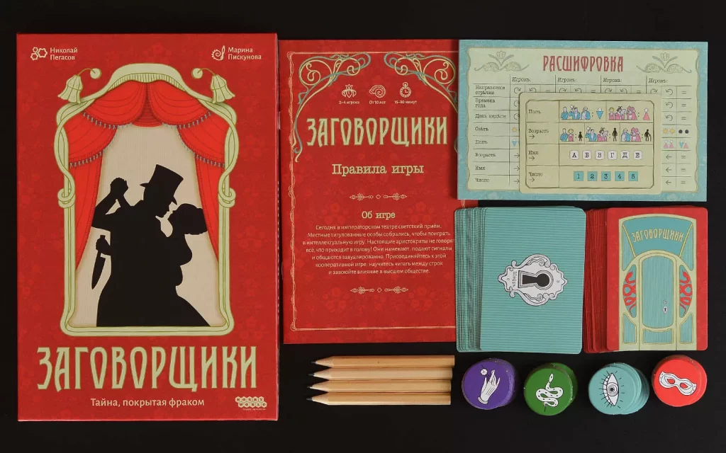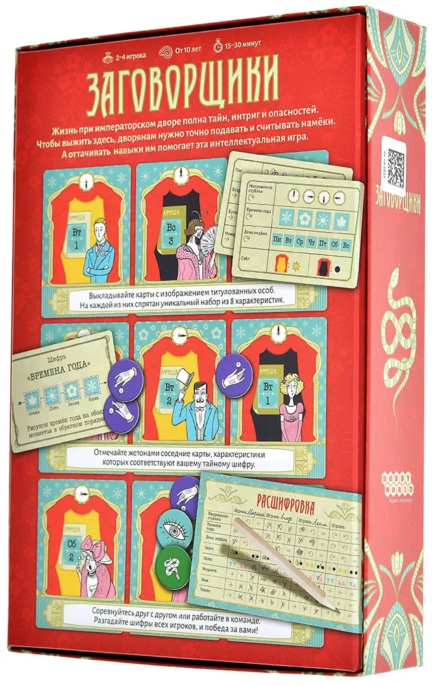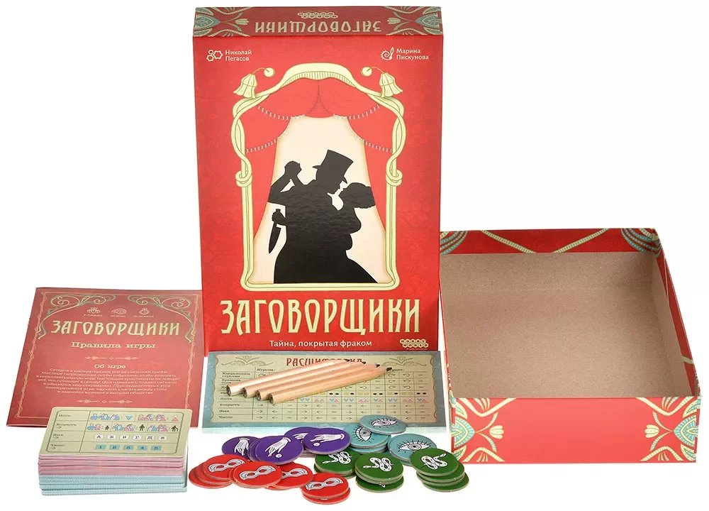 «Заговорщики» рассчитаны на 2–4 игроков, возраст от 10 лет, а партии длятся около 15–30 минут. Игра почти не опирается на случайность, здесь важно внимательно следить за каждой парой карт, замечать, кто и когда ставит сигналы, и делать аккуратные логические выводы. Ретро‑оформление с аристократическими персонажами создаёт атмосферу светского приёма и тайных обществ, а компактная коробка делает игру удобным спутником для поездок или приятным «мозговым десертом» перед большой настолкой.