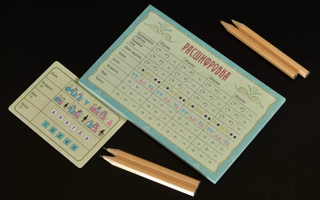 • Блокнот — листы с таблицами для отметки возможных и исключённых шифров по каждому игроку.